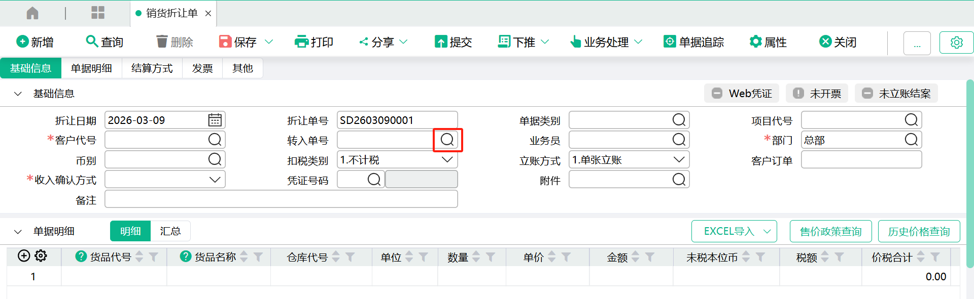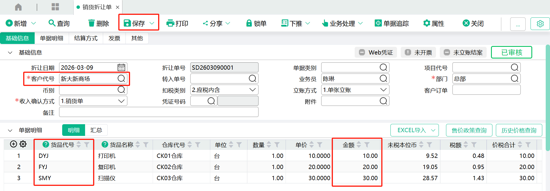 (1)、进入【销货折让单】页面,输入表头客户、部门、收入确认方式,输入表身货品、仓库代号、数量、单价、金额,点【保存】。