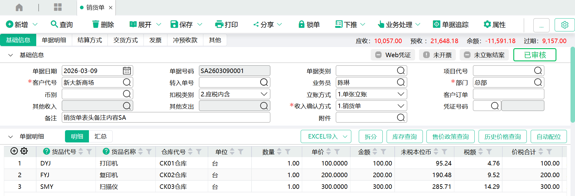 (2)、应收账款:当表头立账方式为单张立账时,产生负数应收账款。