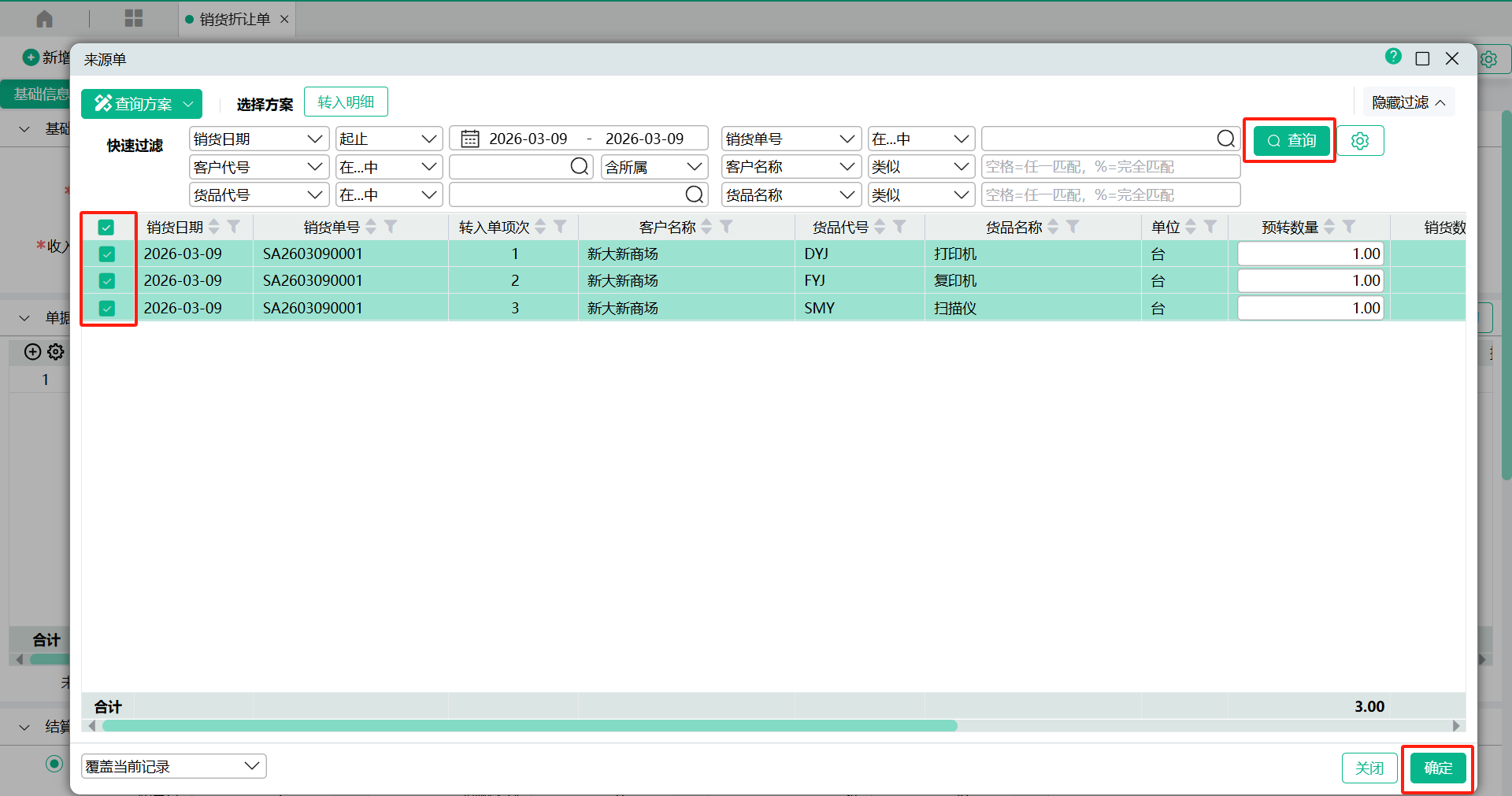 (2)、进入【销货折让单】页面,点入表头【转入单号】查询窗口,输入过滤条件,查询出销货单,勾选要转入的单据记录,点【确定】;