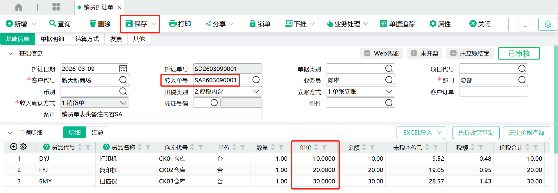 (3)、带入表身记录后,手工修改要折让的单价、金额,点【保存】。