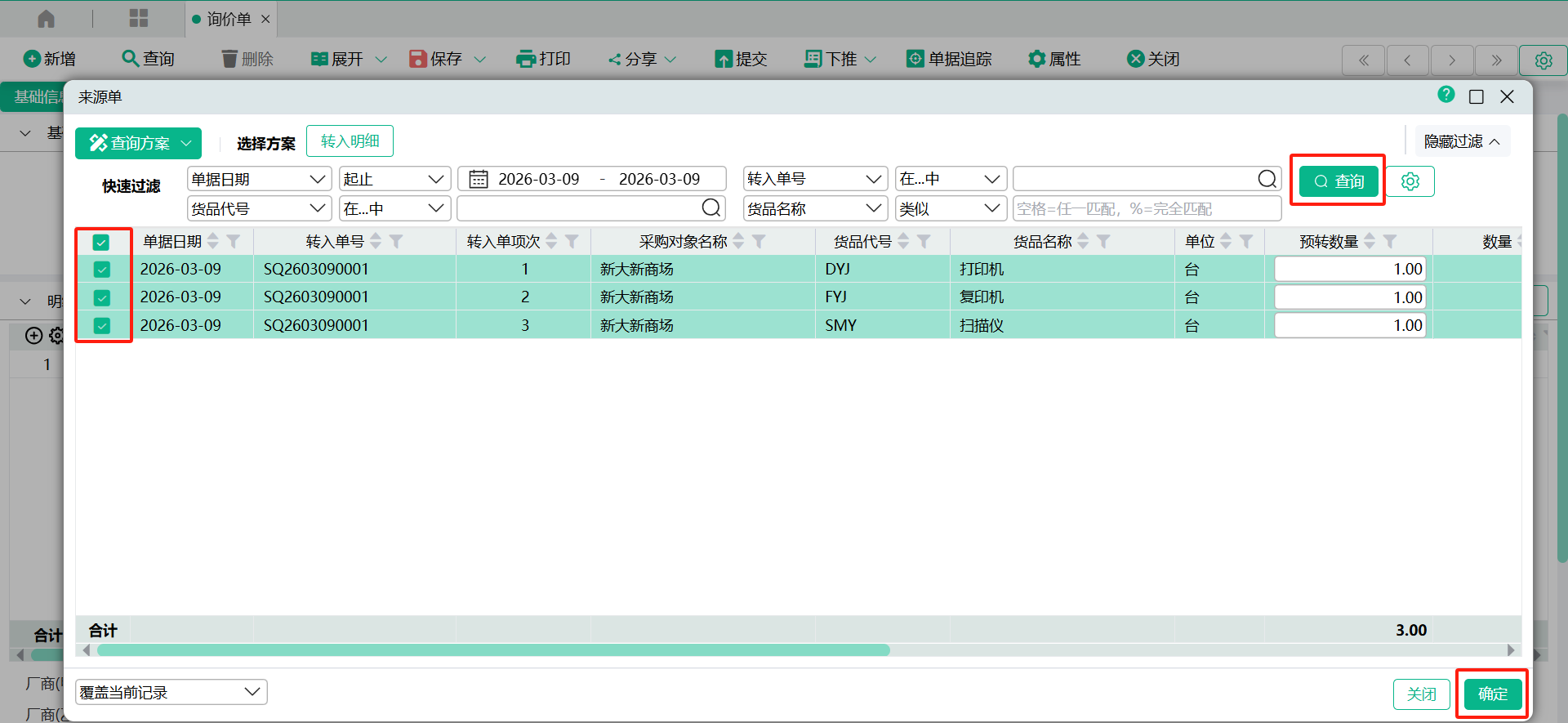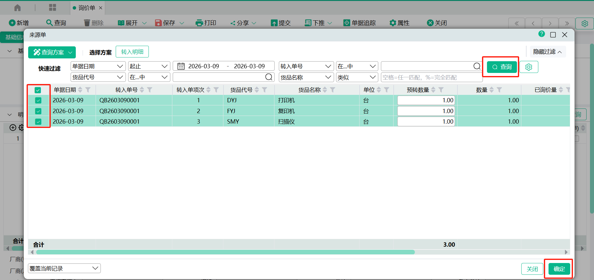 (2)、进入【询价单】页面,点入表头【转入单号】-【从请购单转入】查询窗口,输入过滤条件,查询出请购单,勾选要转入的单据记录,点【确定】;
