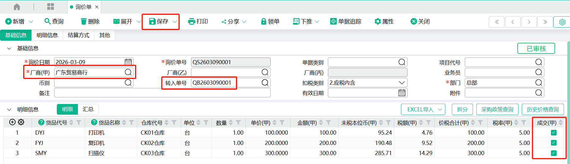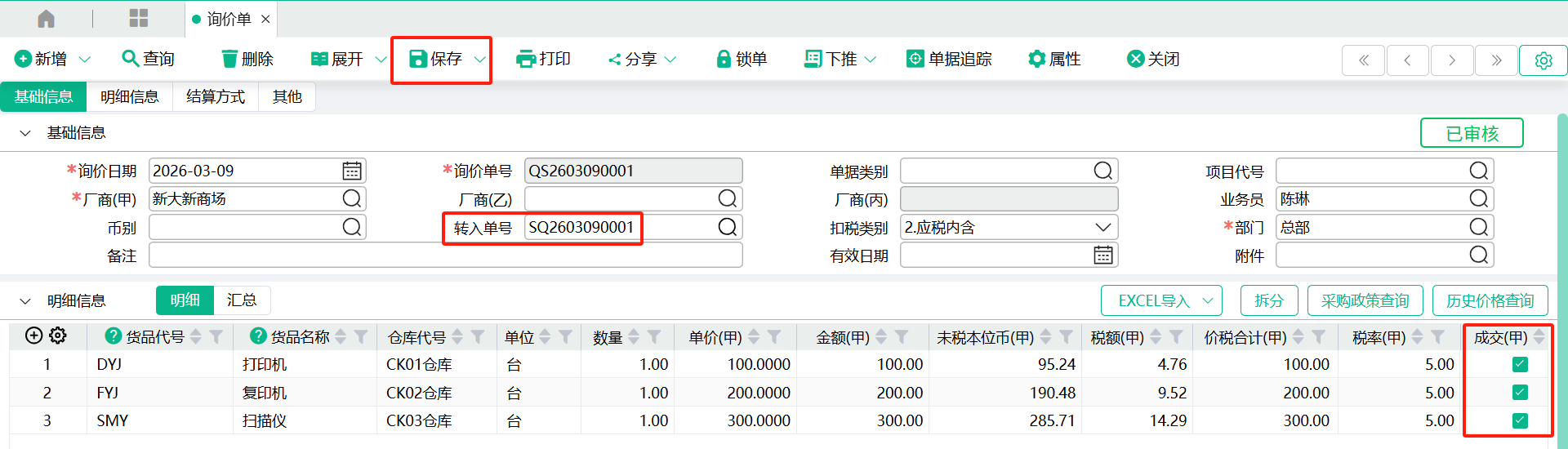 (3)、带入表身记录后,输入表头厂商(甲),勾上表身成交(甲),点【保存】。