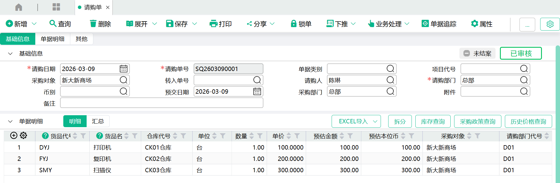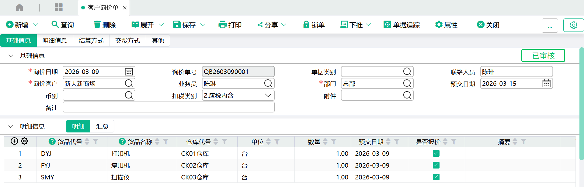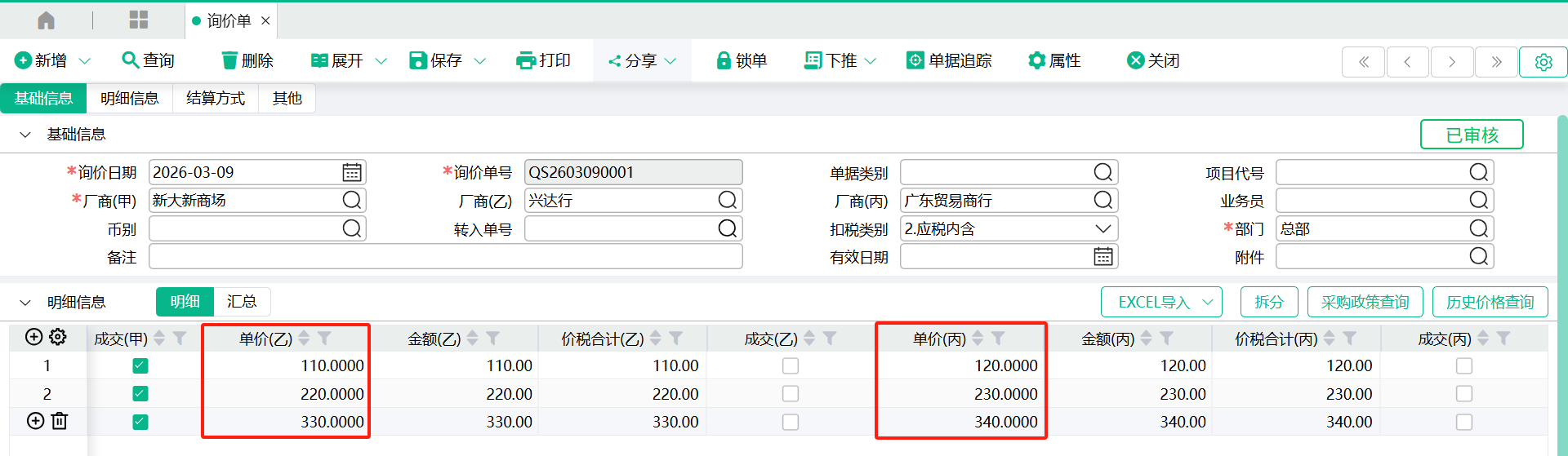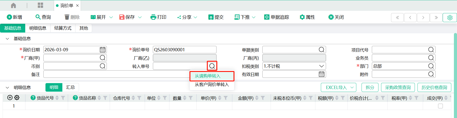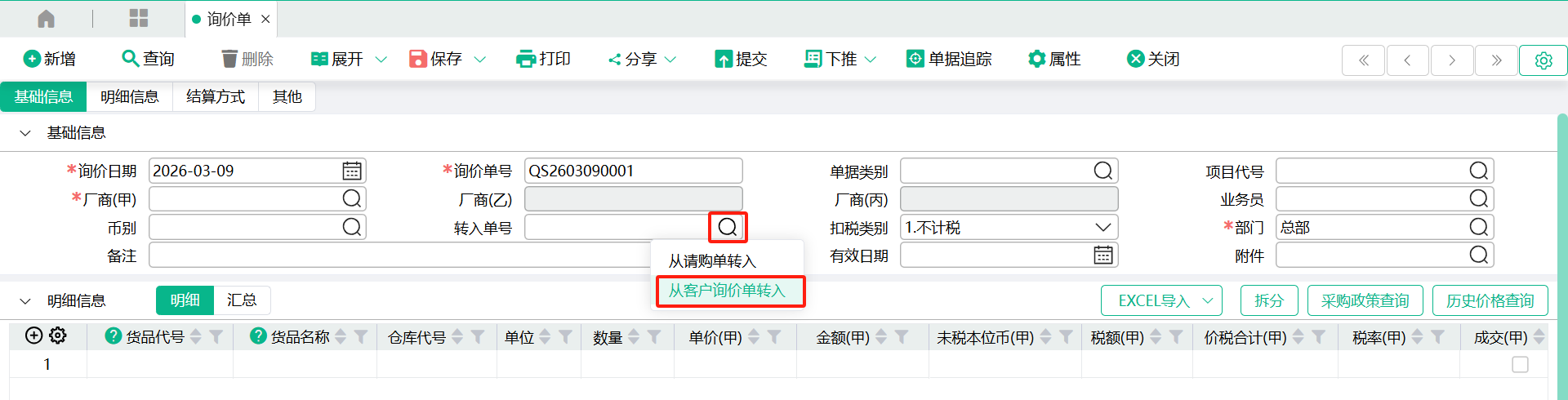 (3)、来源单回写:从请购单转入,回写请购单表身【询价量】;从客户询价单转入,回写客户询价单表身【已询价量】。