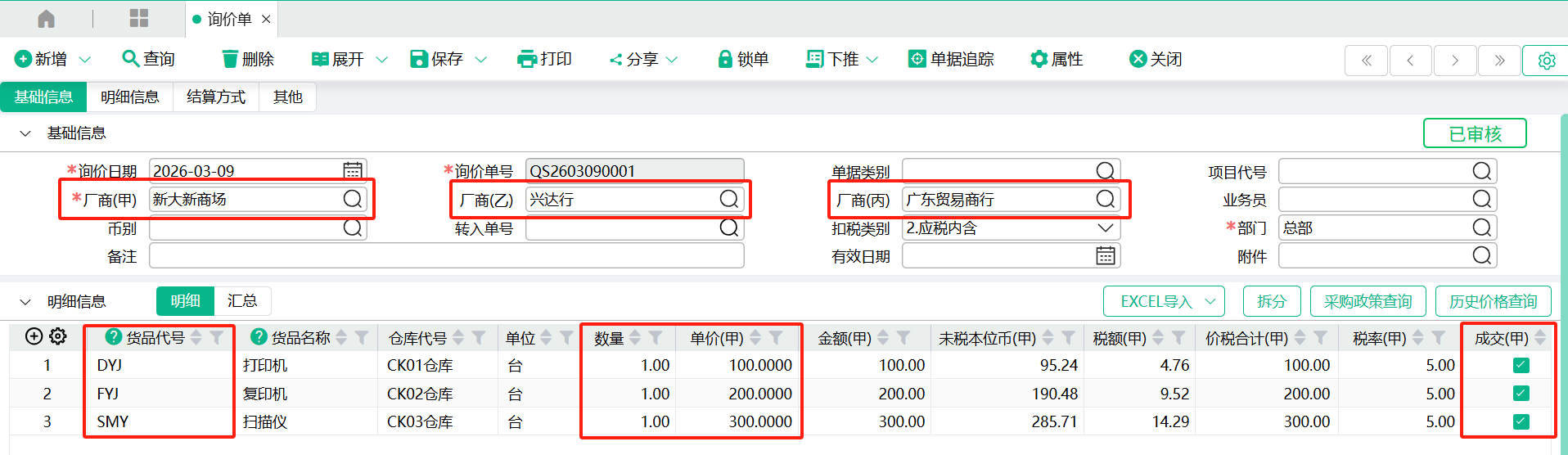 (1)、进入【询价单】页面,输入表头厂商(甲),同时可输入三家厂商,还可以输入厂商(乙)、厂商(丙)、部门,输入表身货品、仓库代号、数量、单价 (甲) 、单价 (乙) 、单价 (丙) ,表身勾上要成交的厂商,只能选一个成交,成交 (甲) 、成交(乙)、成交(丙) ,点【保存】。