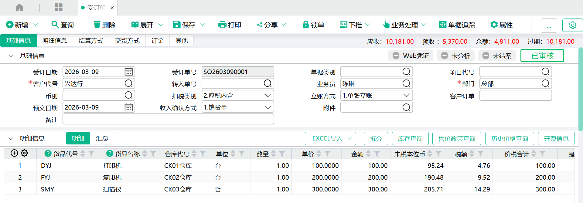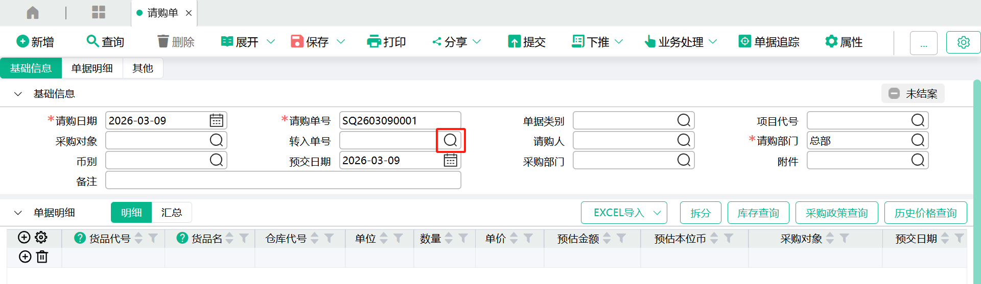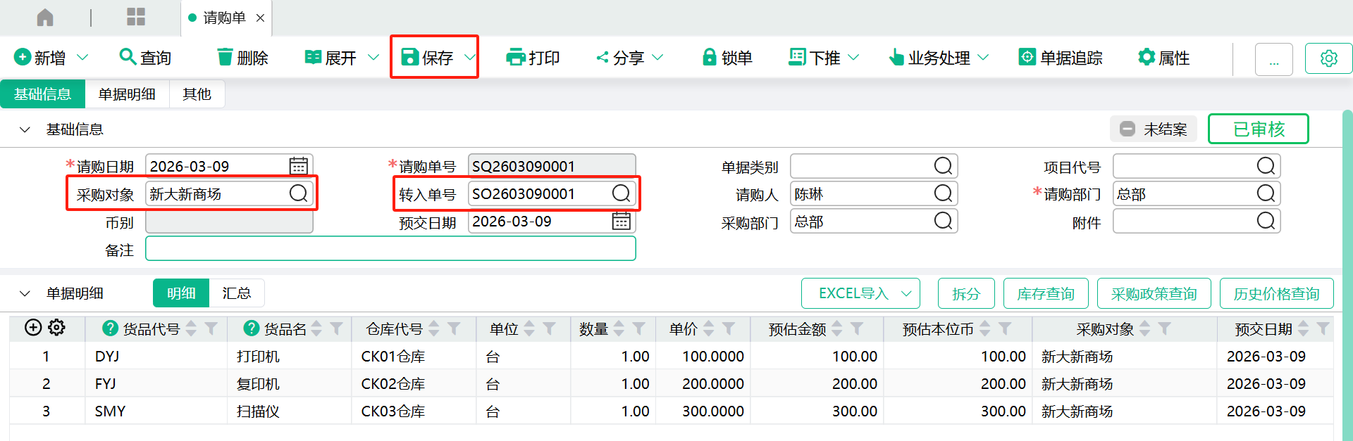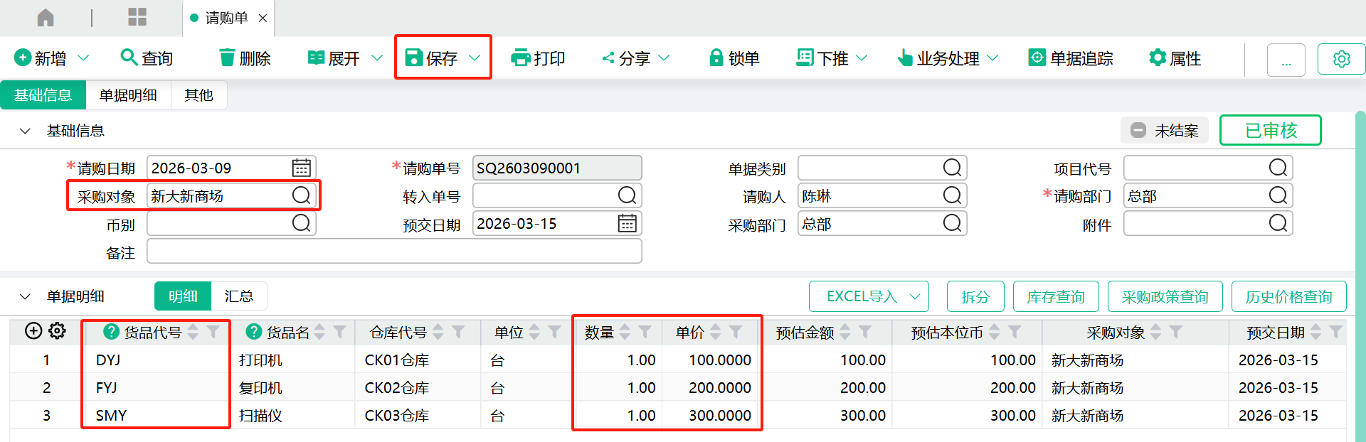 (1)、进入【请购单】页面,输入表头采购对象、采购部门,输入表身货品、仓库代号、数量、单价,点【保存】。