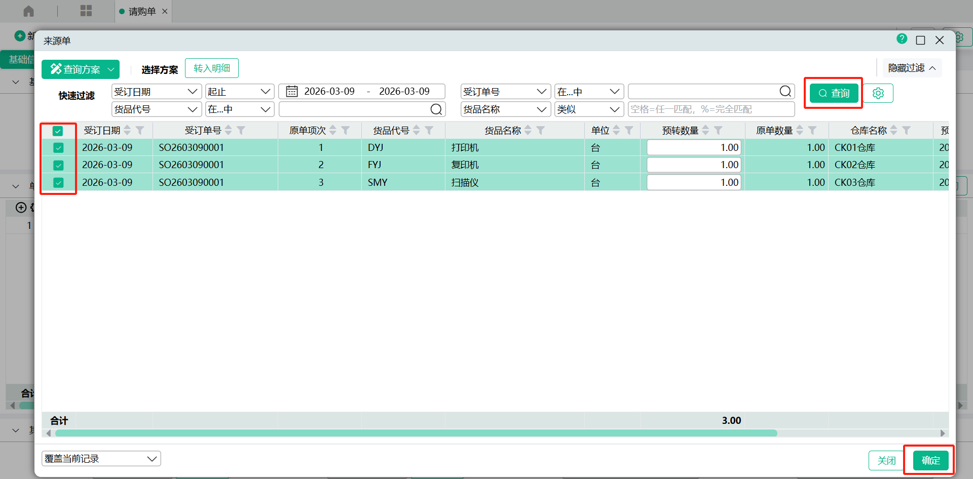 (2)、进入【请购单】页面,点入表头【转入单号】查询窗口,输入过滤条件,查询出受订单,勾选要转入的单据记录,点【确定】;