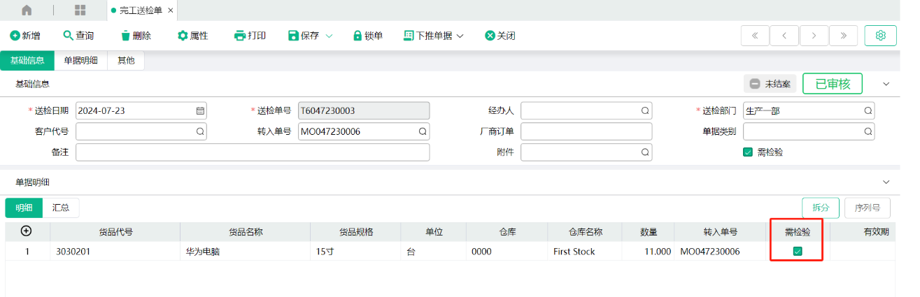 (1)登打完工送检单, 完工送检单表身需检验勾选 ,点击保存 。