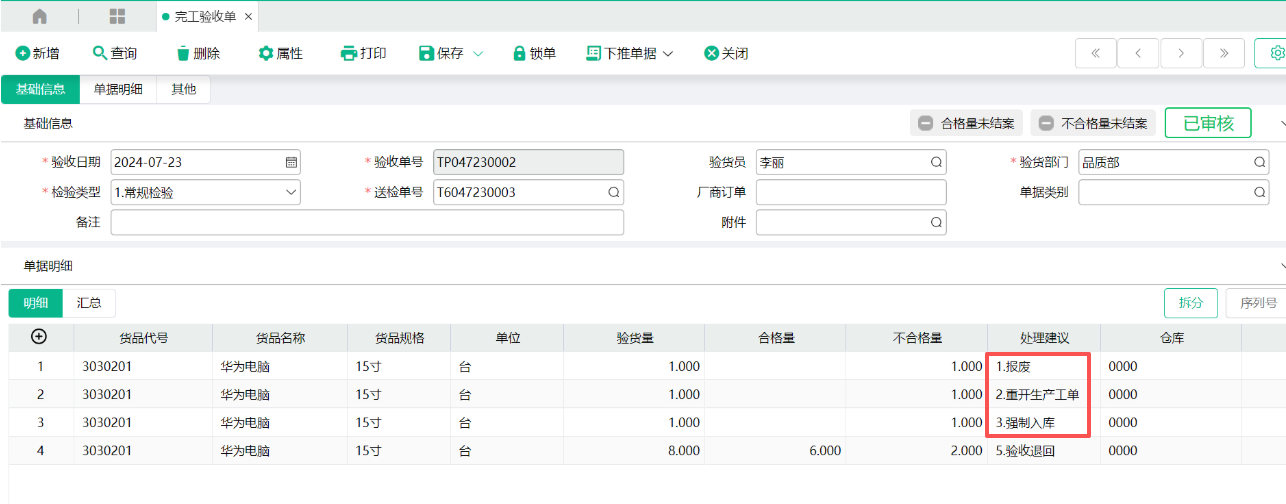 取完工验收单处理建议为1.报废,2重开生产子工单,3强制入库;