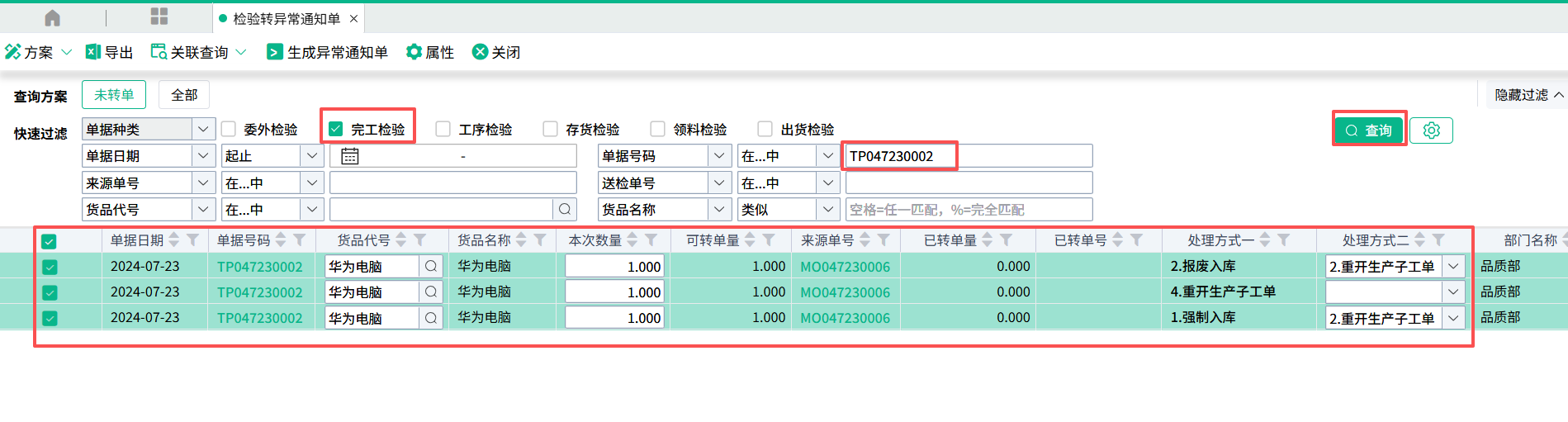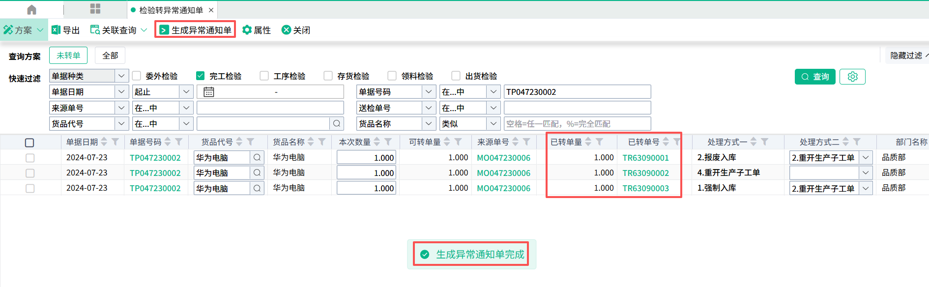 (3)打开,勾选上完工检验,点击过滤,选择需要转单的数据,点击【生成异常通知单】。成功之后会回写表身的已转单量和已转单号。