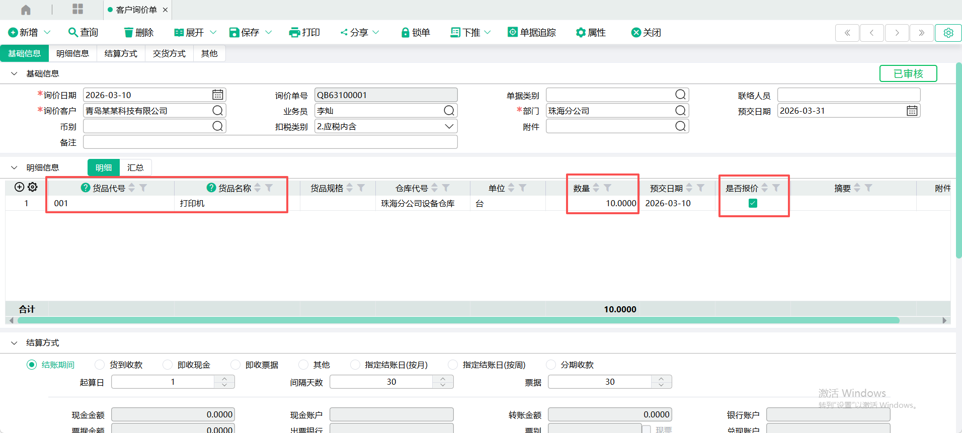 (1)、进入【客户询价单】页面,输入表头询价客户、部门,输入表身货品、仓库代号、数量,点【保存】。