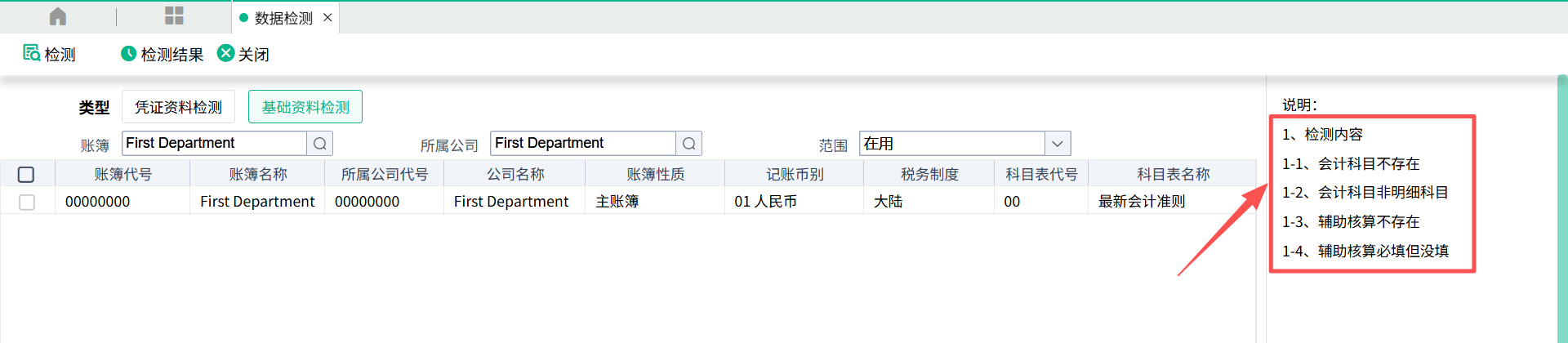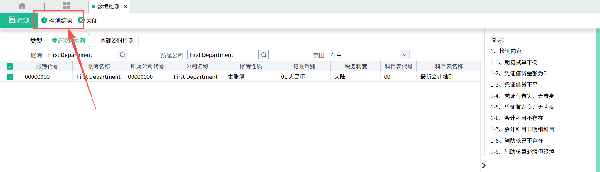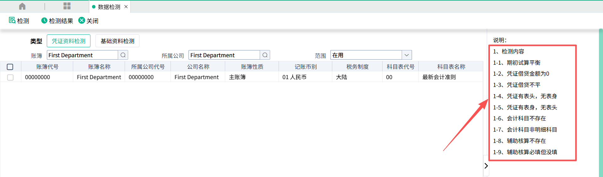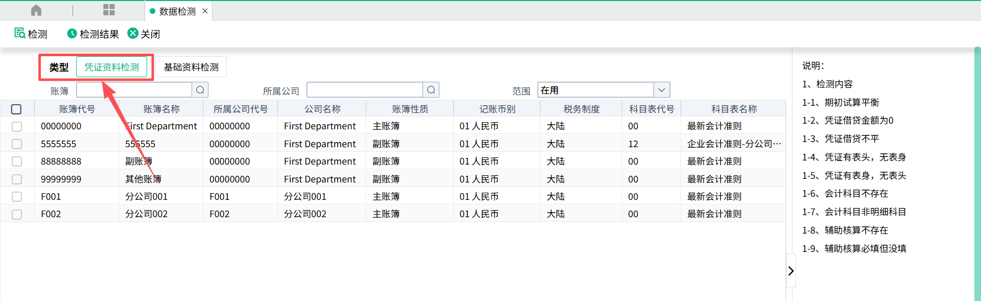 | 类型 | 分凭证资料检测和基础资料检测,检测的数据内容不同,需要切换不同页签做检测 |