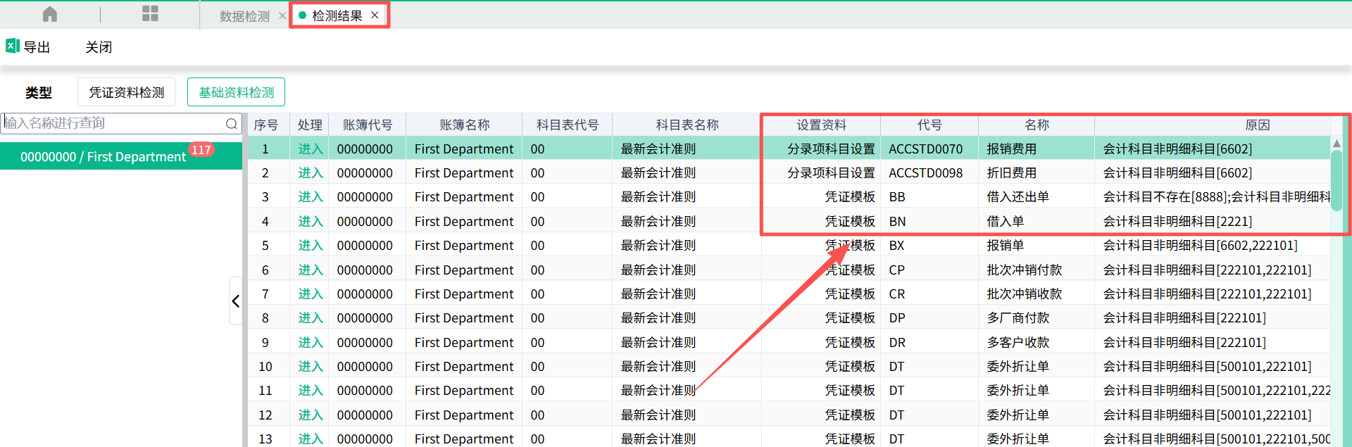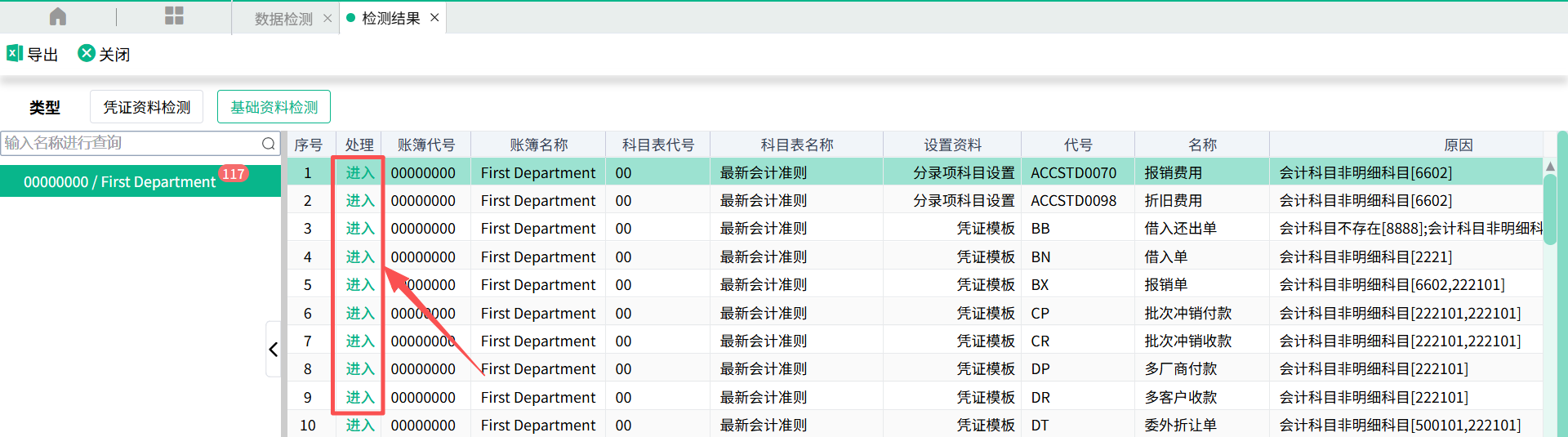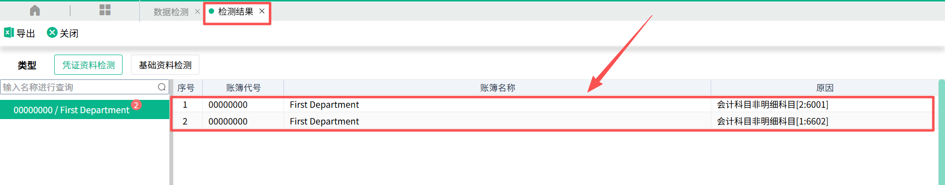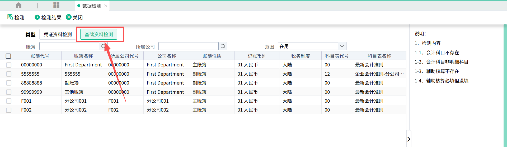 | 类型 | 分凭证资料检测和基础资料检测,检测的数据内容不同,需要切换不同页签做检测 |