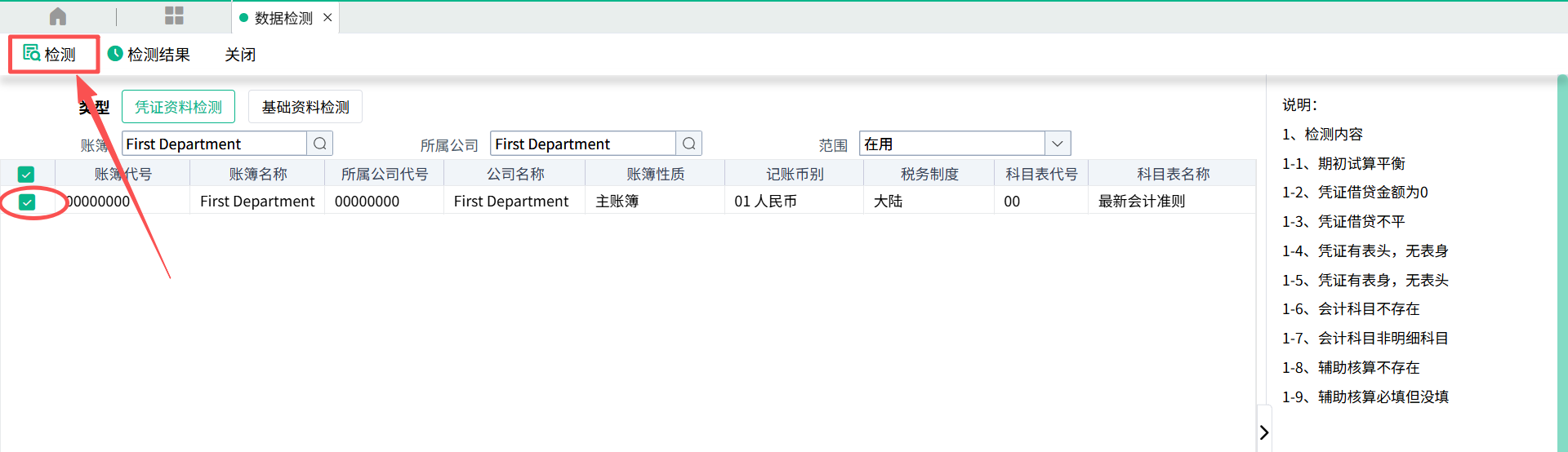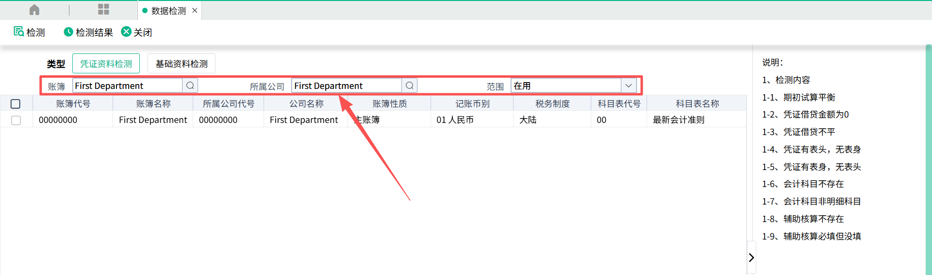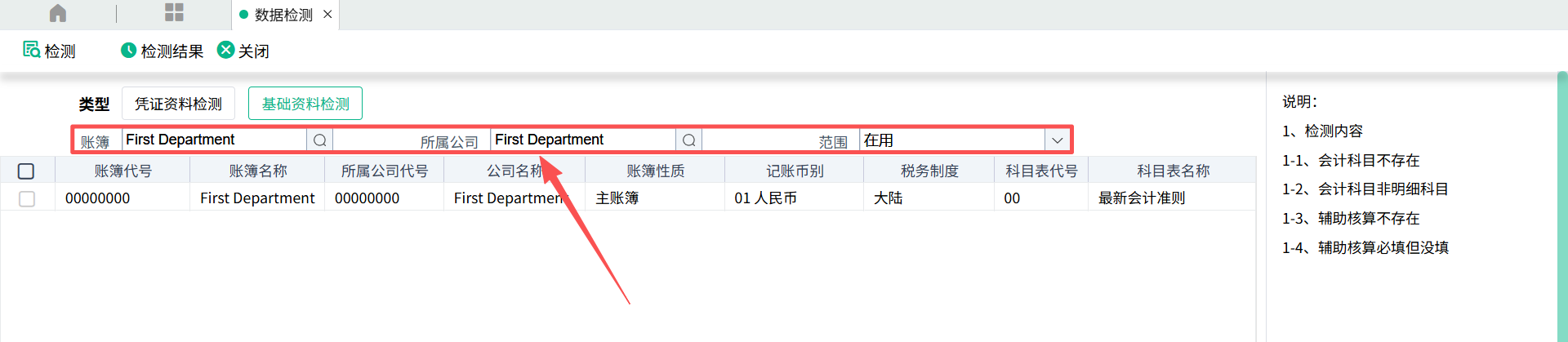 - 可设置过滤条件,含账簿/所属公司/范围,来过滤要检测的账簿信息