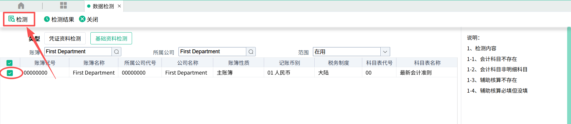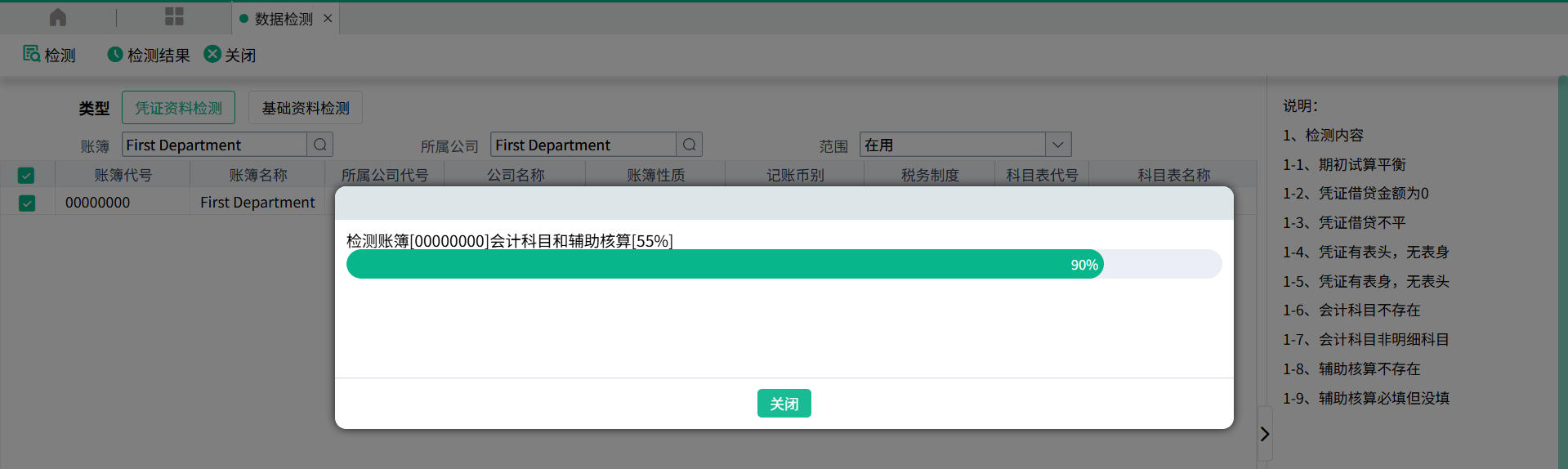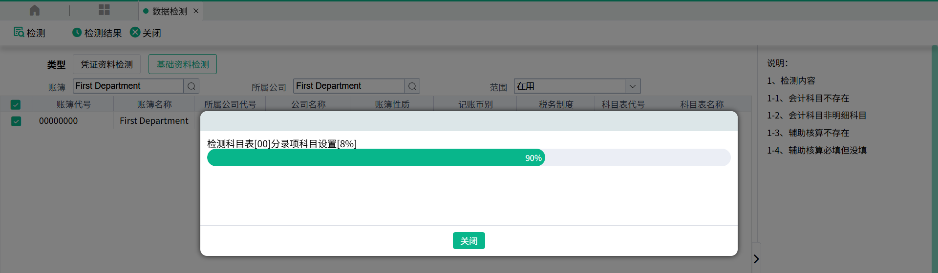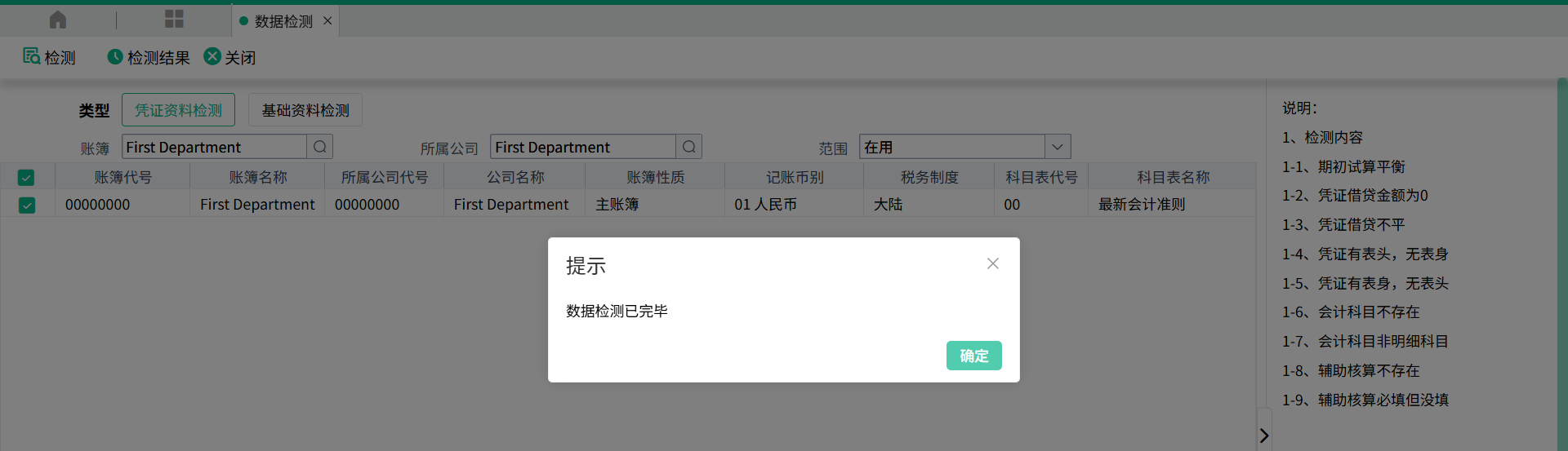 - 勾选账簿资料,之后点击“检测”按钮,检测完成会提示:数据检测已完毕