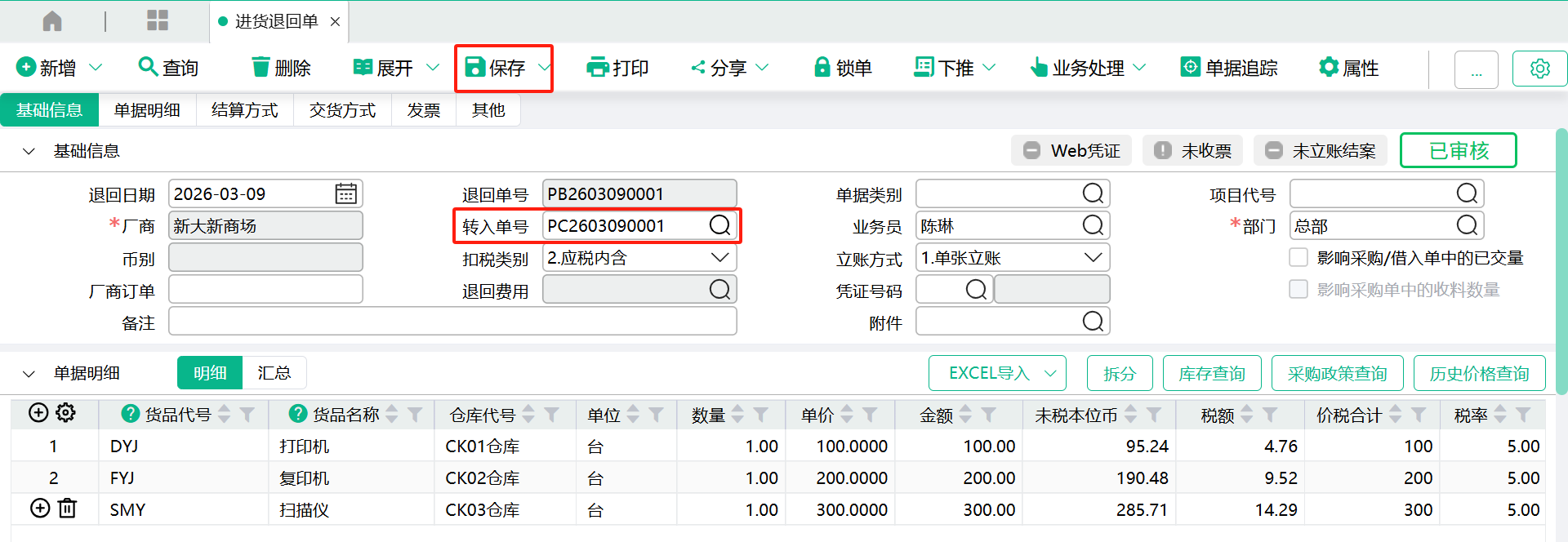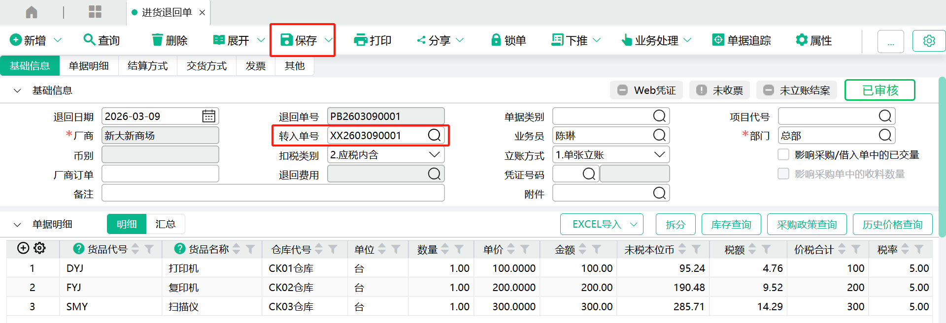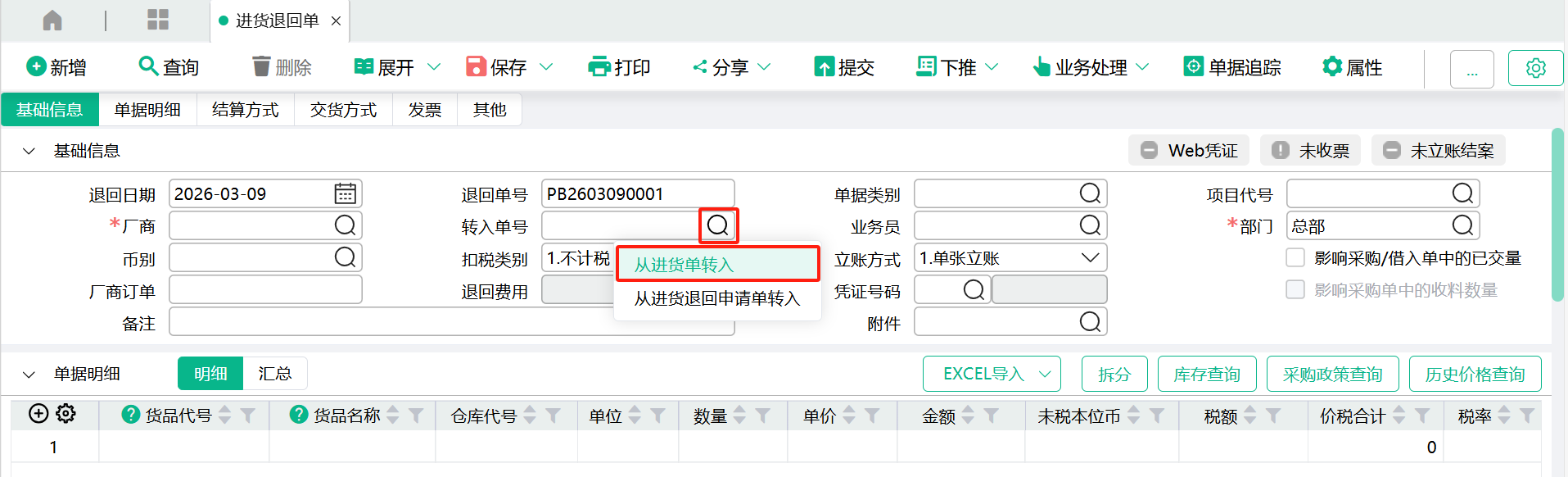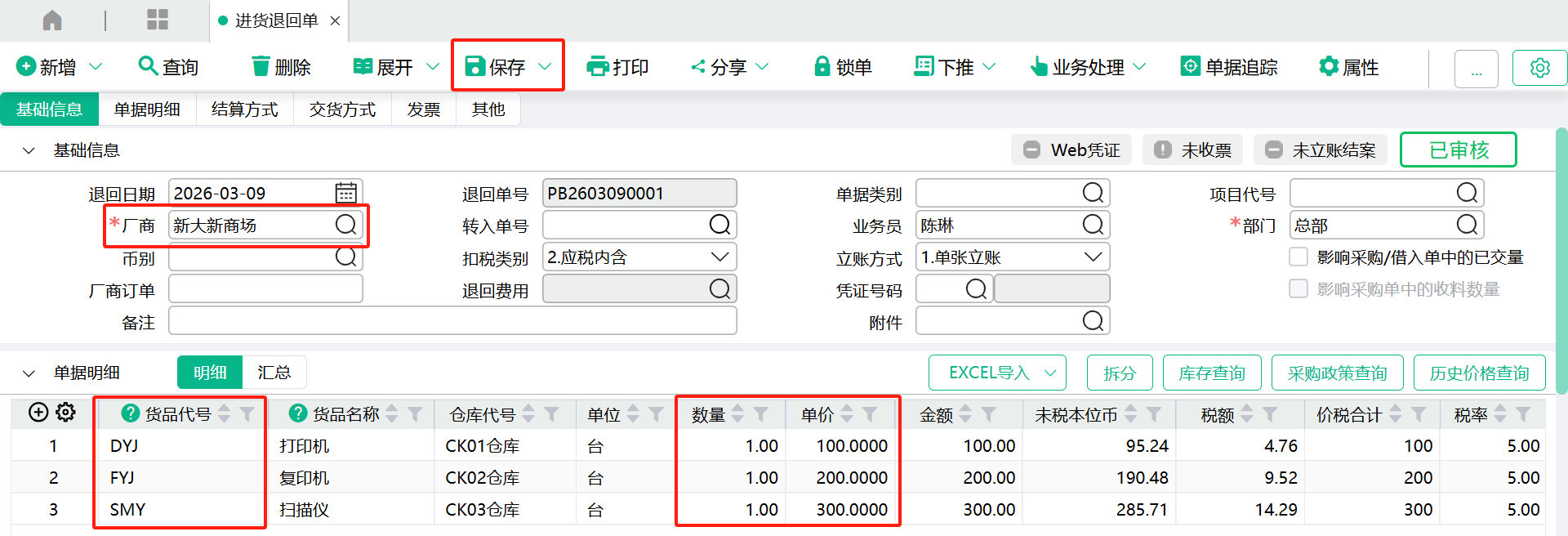 (1)、进入【进货退回单】页面,输入表头厂商、部门,输入表身货品、仓库代号、数量、单价,点【保存】。