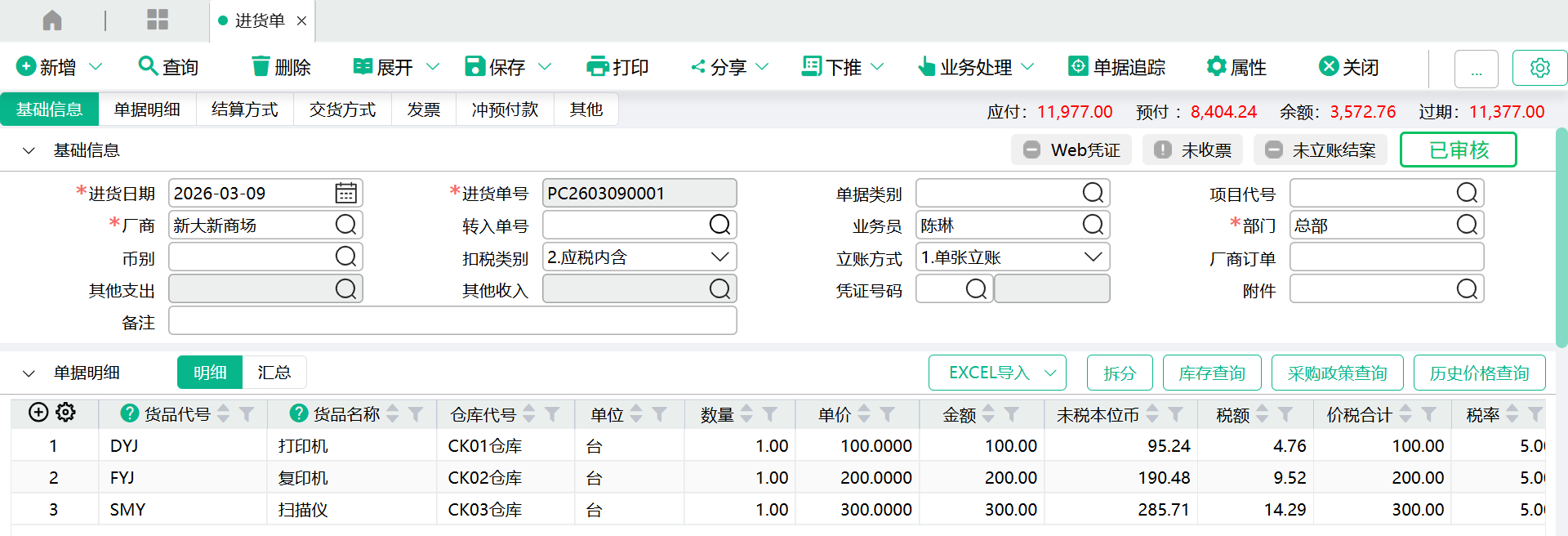 (2)、应付账款:当表头立账方式为单张立账时,产生负数应付账款。