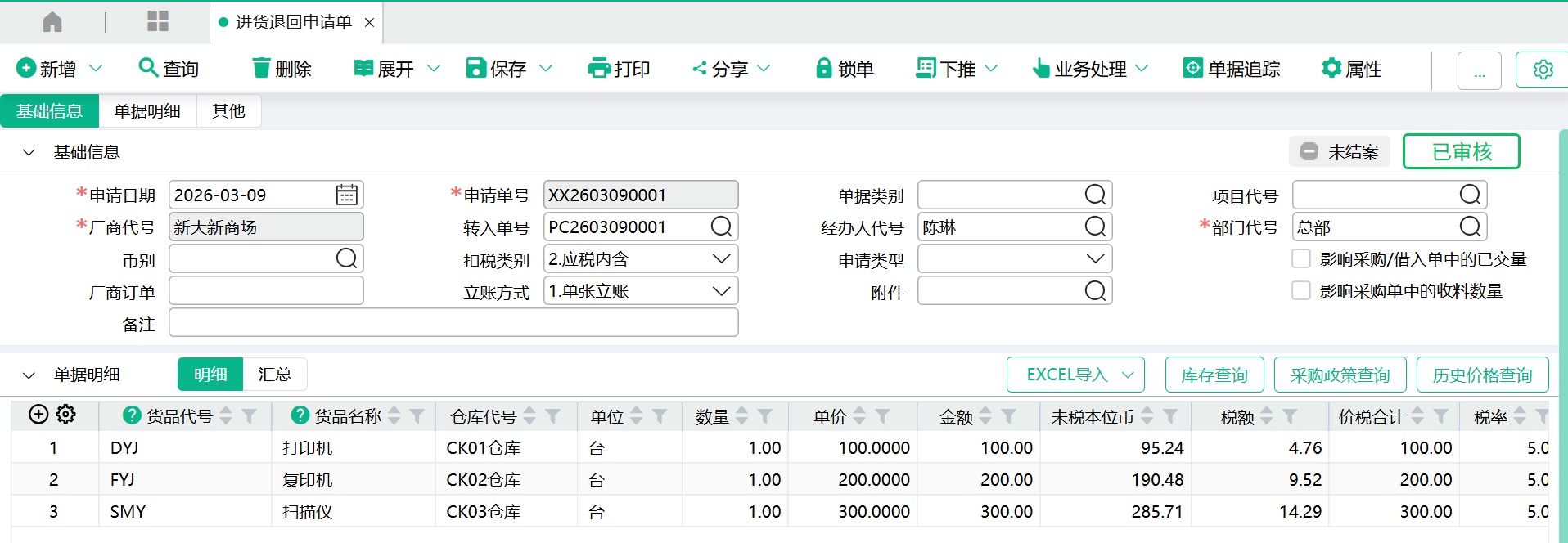 (3)、来源单回写:从进货单转入,回写进货单表身【未审核退回量】;从进货退回申请单转入,回写进货退回申请单表身【未审核已转单量】。