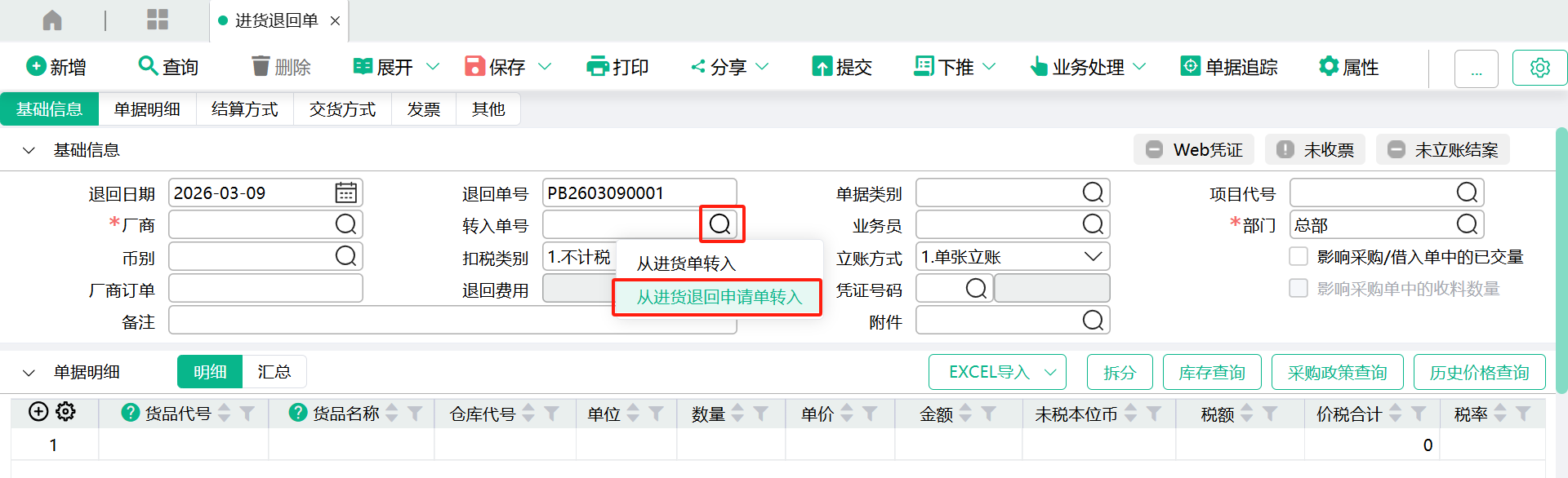 (3)、来源单回写:从进货单转入,回写进货单表身【进货退回量】;从进货退回申请单转入,回写进货退回申请单表身【已转单量】。