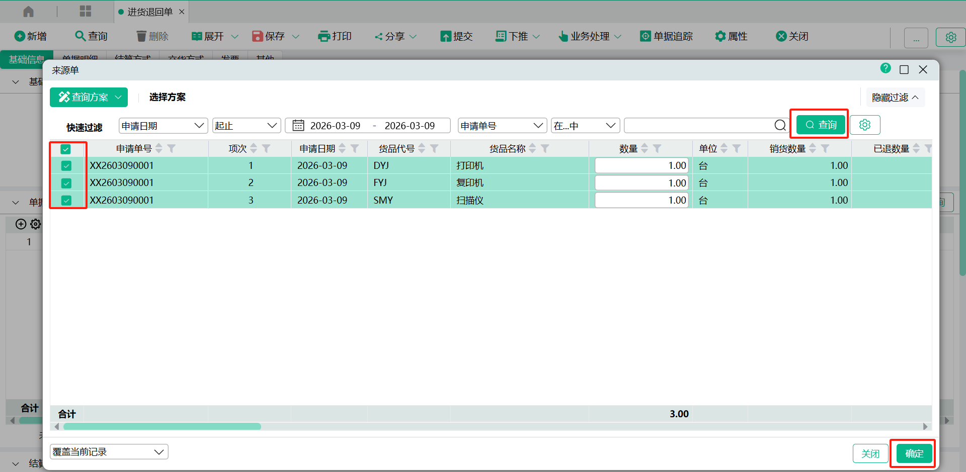 (2)、进入【进货退回单】页面,点入表头【转入单号】-【从进货退回申请单转入】查询窗口,输入过滤条件,查询出进货退回申请单,勾选要转入的单据记录,点【确定】;