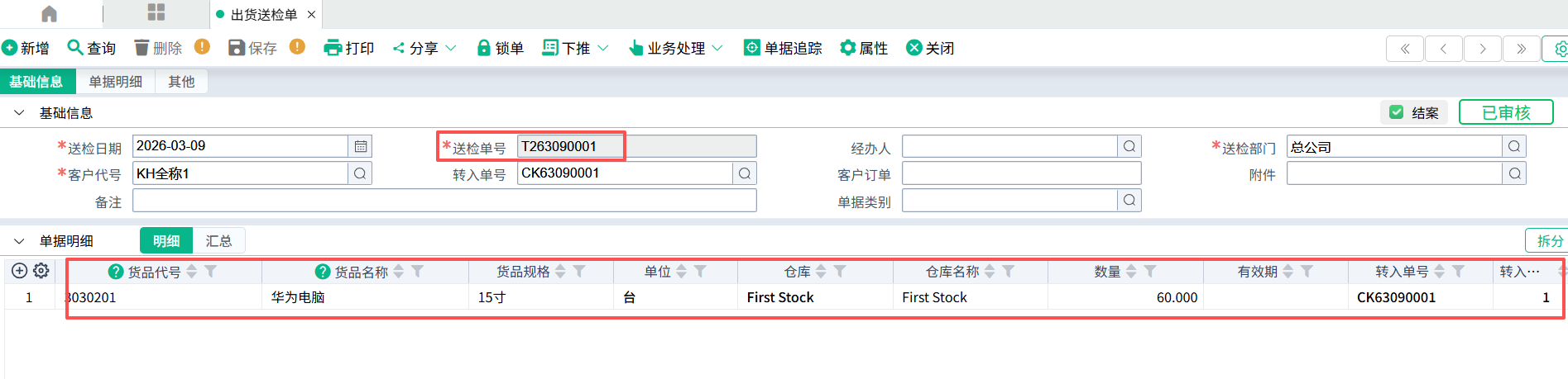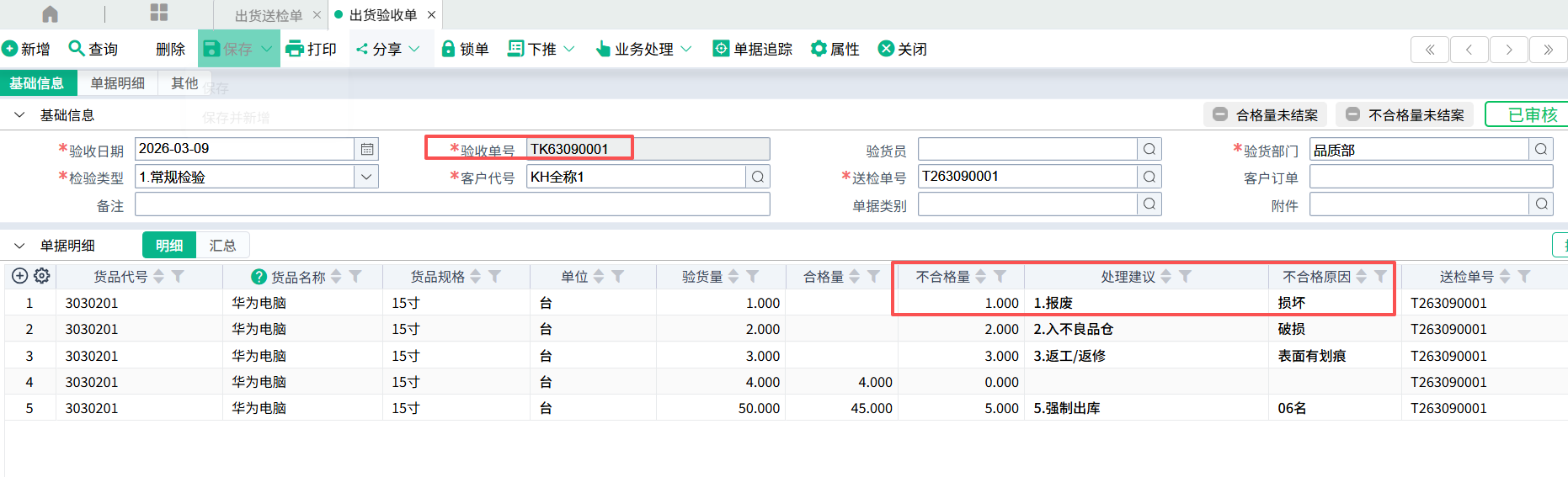 (2) 打开出货验收单,点击表头的送检单号,过滤出出货送检单,确定,带出数据到表身 。输入验货量,合格量,不合格量,不合格的处理建议为 1.报废。 点击保存。
