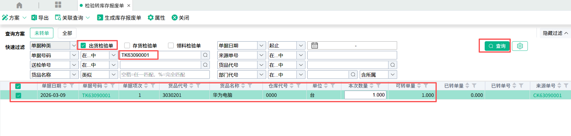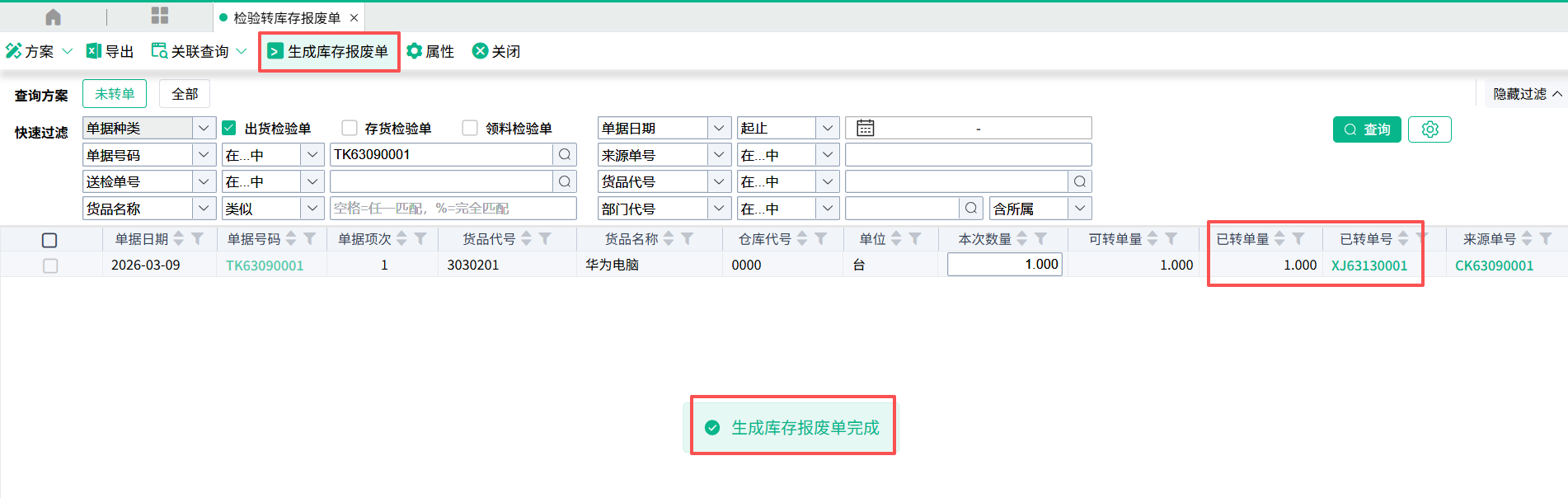 (3)打开,勾选上出货检验,点击过滤,选择需要转单的数据,点击【生成库存报废单】。成功之后会回写表身的已转单量和已转单号。