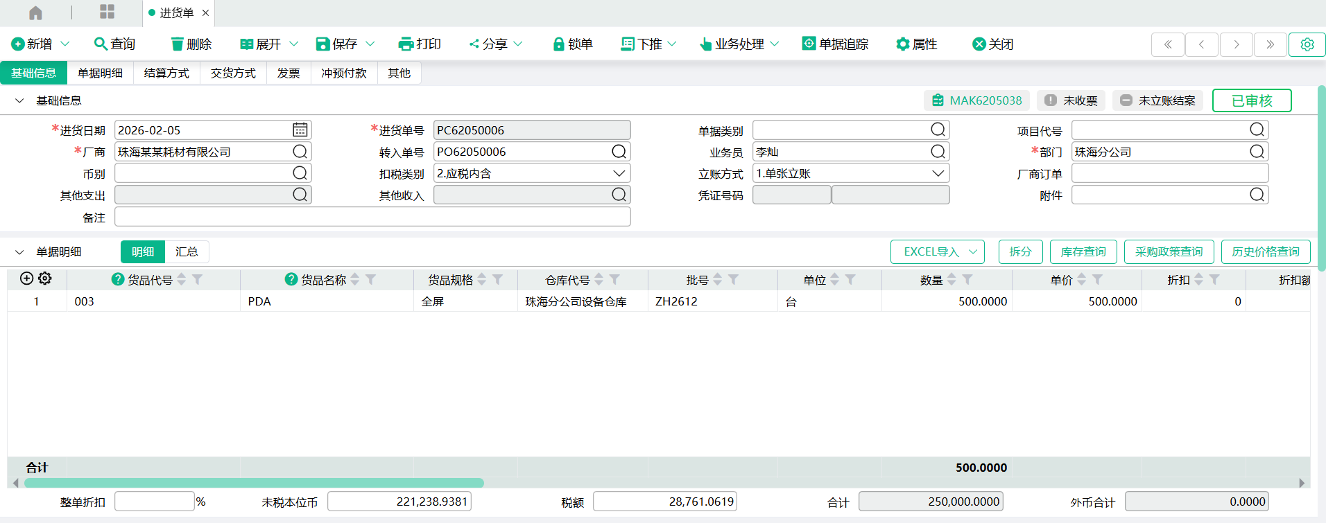 1、转入【进货单】