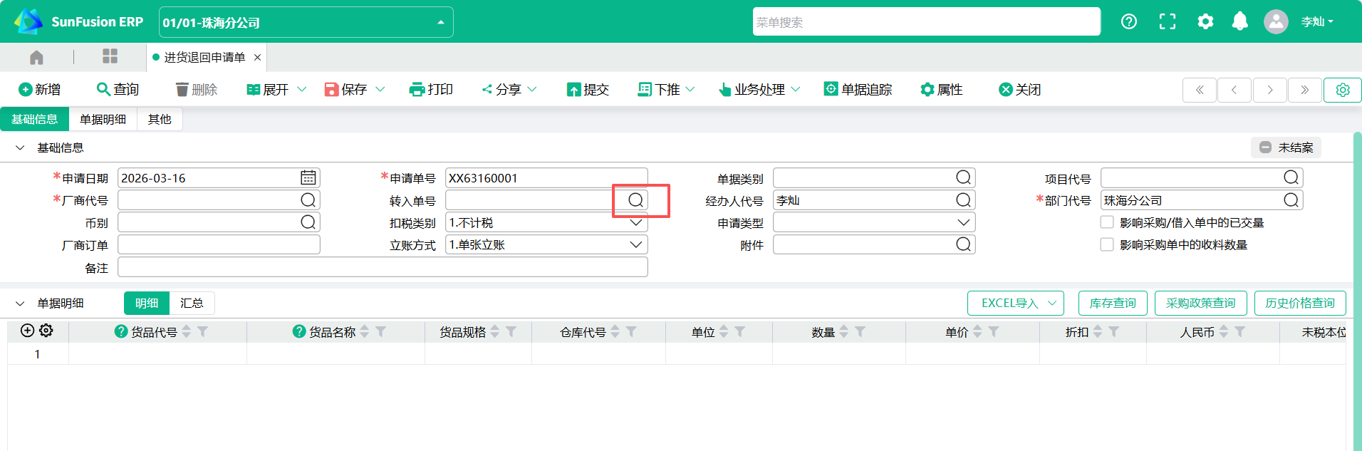 菜单位置:供应链——采购管理——进货管理——进货退回申请单