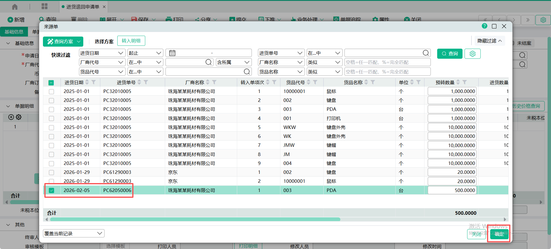 (2)进入【进货退回申请单】页面,点入表头【转入单号】查询窗口,输入过滤条件,查询出进货单,勾选要转入的单据记录,点【确定】 ;