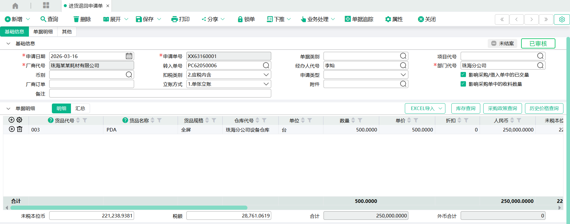进货申请退回单