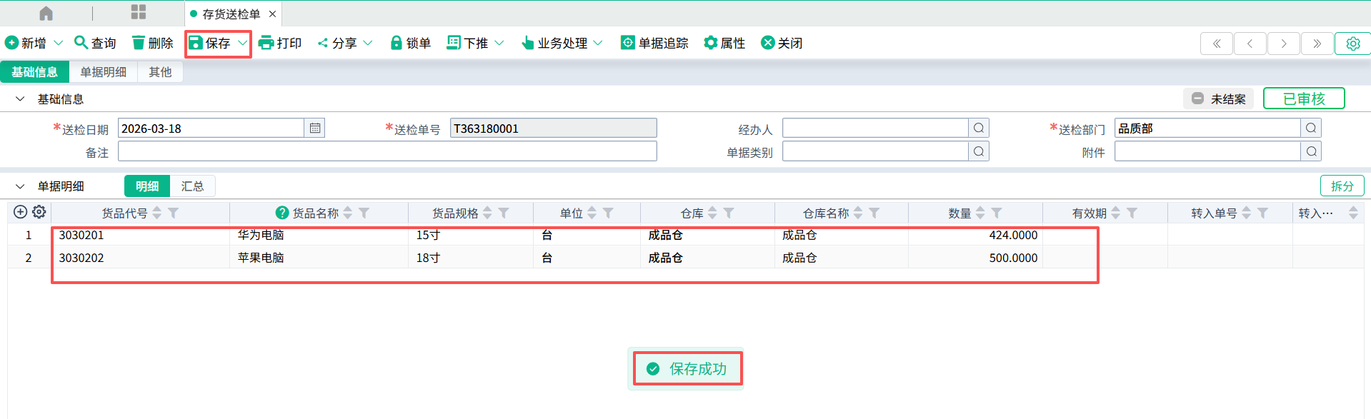 (1)手工录入存货送检单数据, 检测数据正确性,点击保存,保存成功即存货送检单登打完毕。