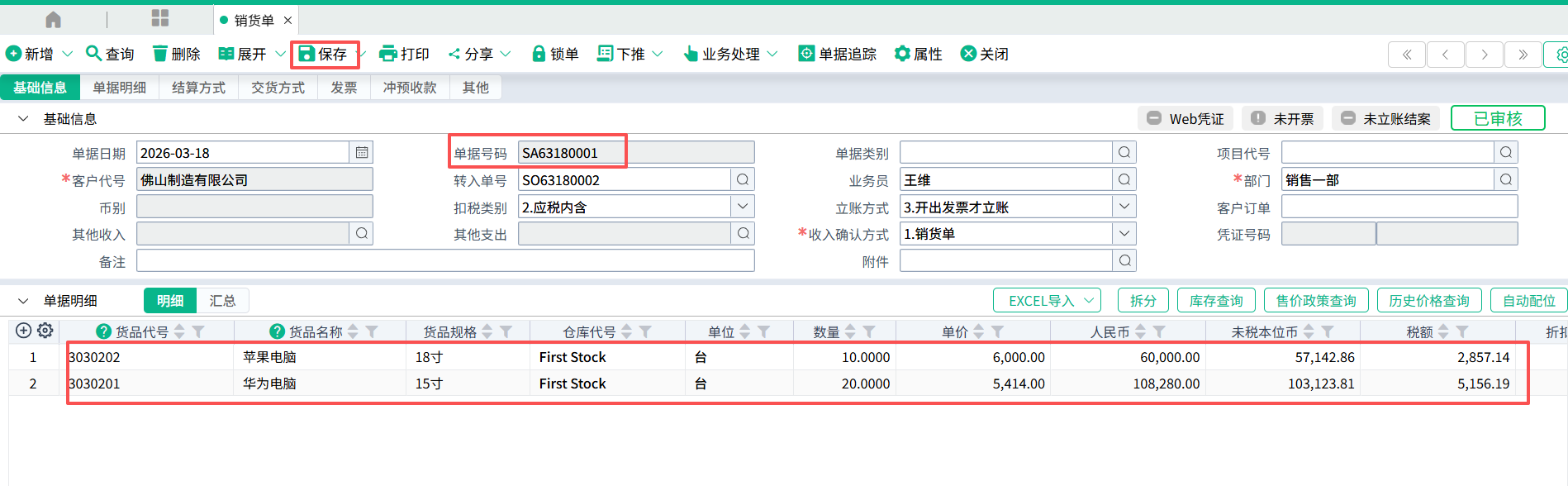 (2)登打好销货单数据,保存。