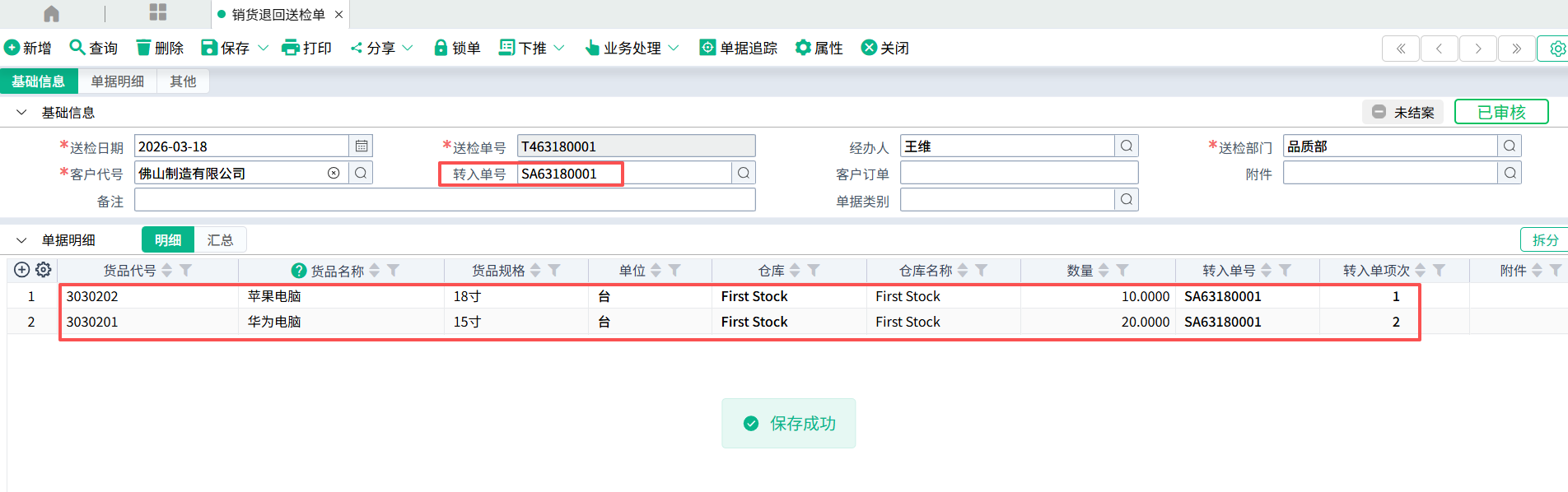 | 转入单号 | 检测数据正确性,点击保存,保存成功即销货退回送检单登打完毕。 |