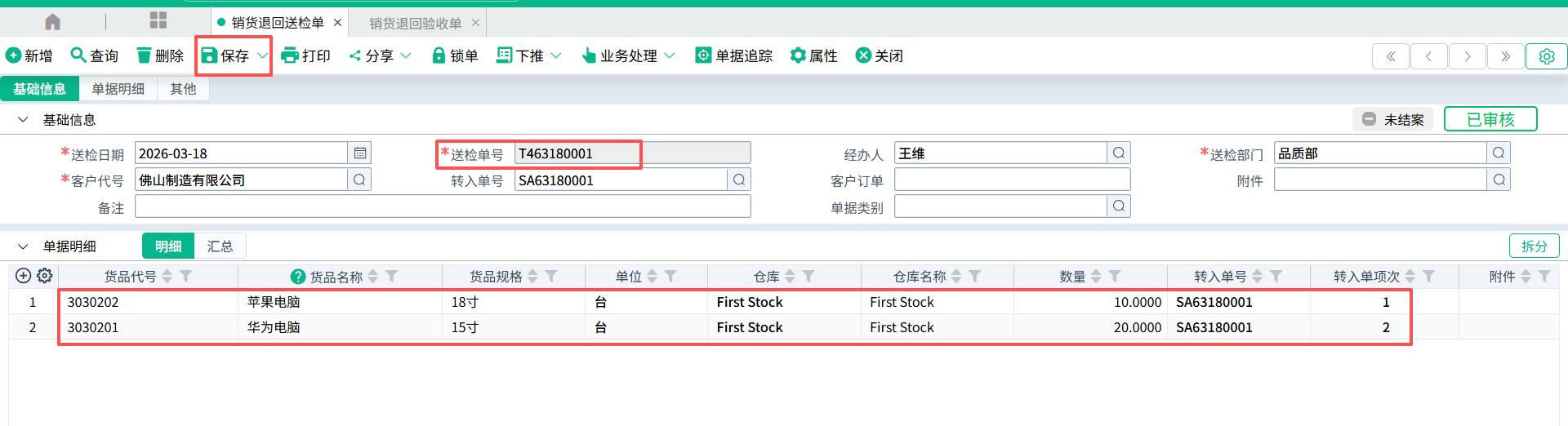 (1)登打销货退回送检单,保存。