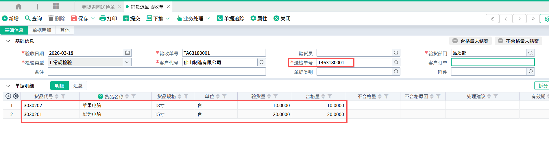 | 货品代号,货品名称,仓库 | 根据送检单号自动带出对应栏位的值。 |