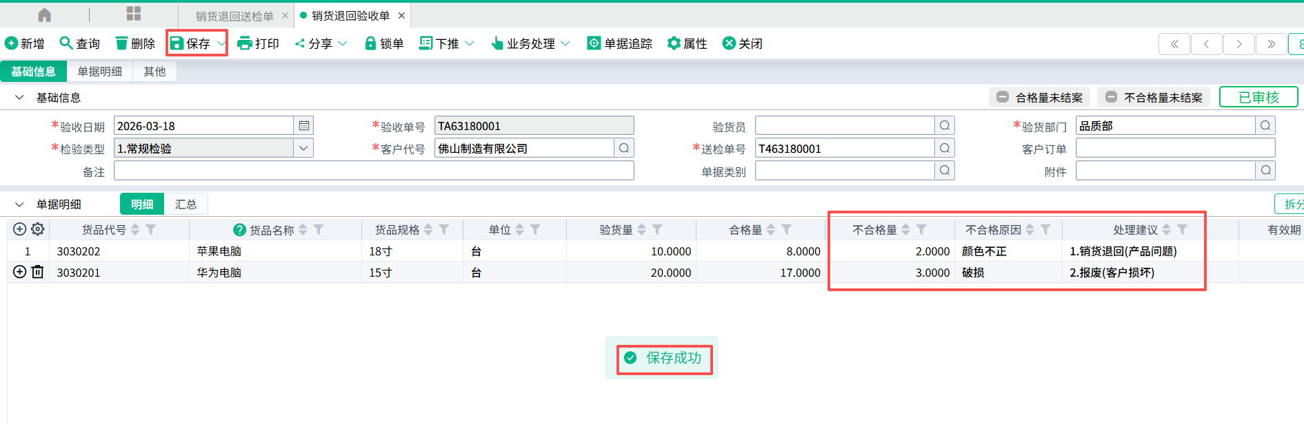 (3)输入验货量,合格量,不合格量,如果有不合格量,不合格原因和处理建议也需输入。有多个不合格处理建议时,可以拆分不合格量。 检测数据正确性,点击保存,即销货退回验收单登打完成。