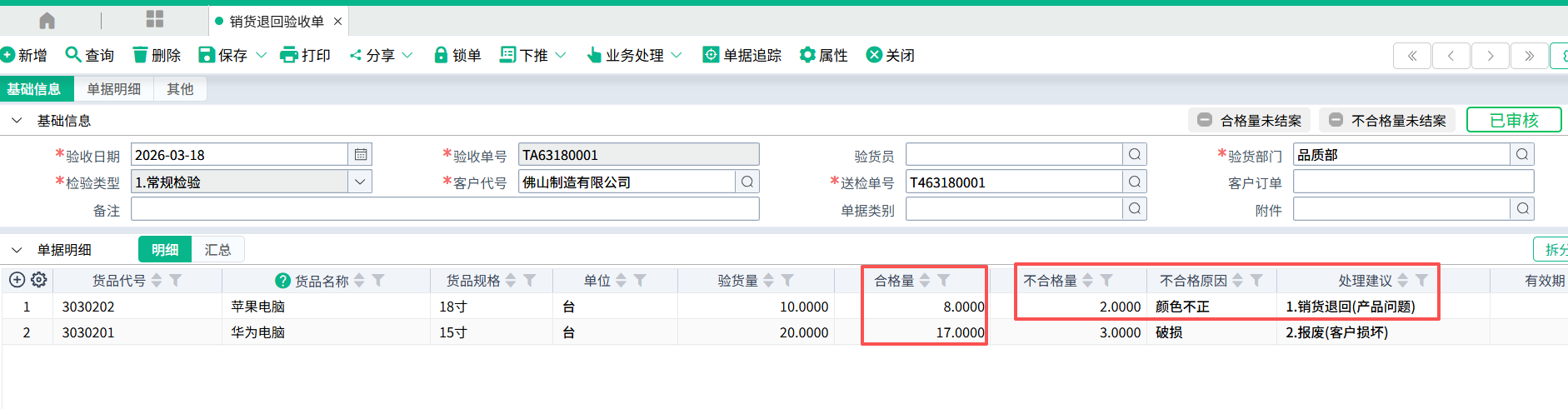 当不合格,取处理建议为1.销货退回(产品问题)对应的不合格量。