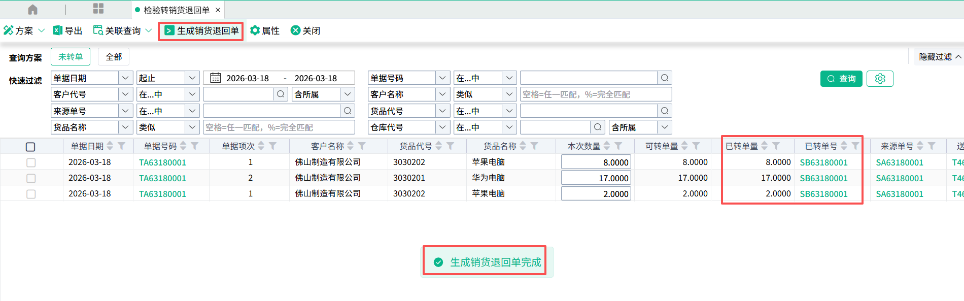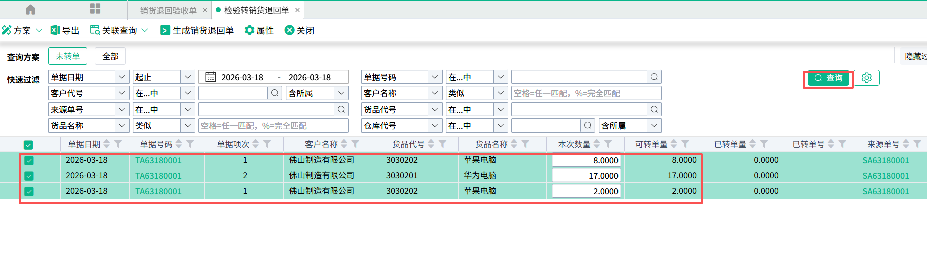 (3)打开,点击查询,选择需要转单的数据,点击【生成销货退回单】。成功之后会回写表身的已转单量和已转单号。