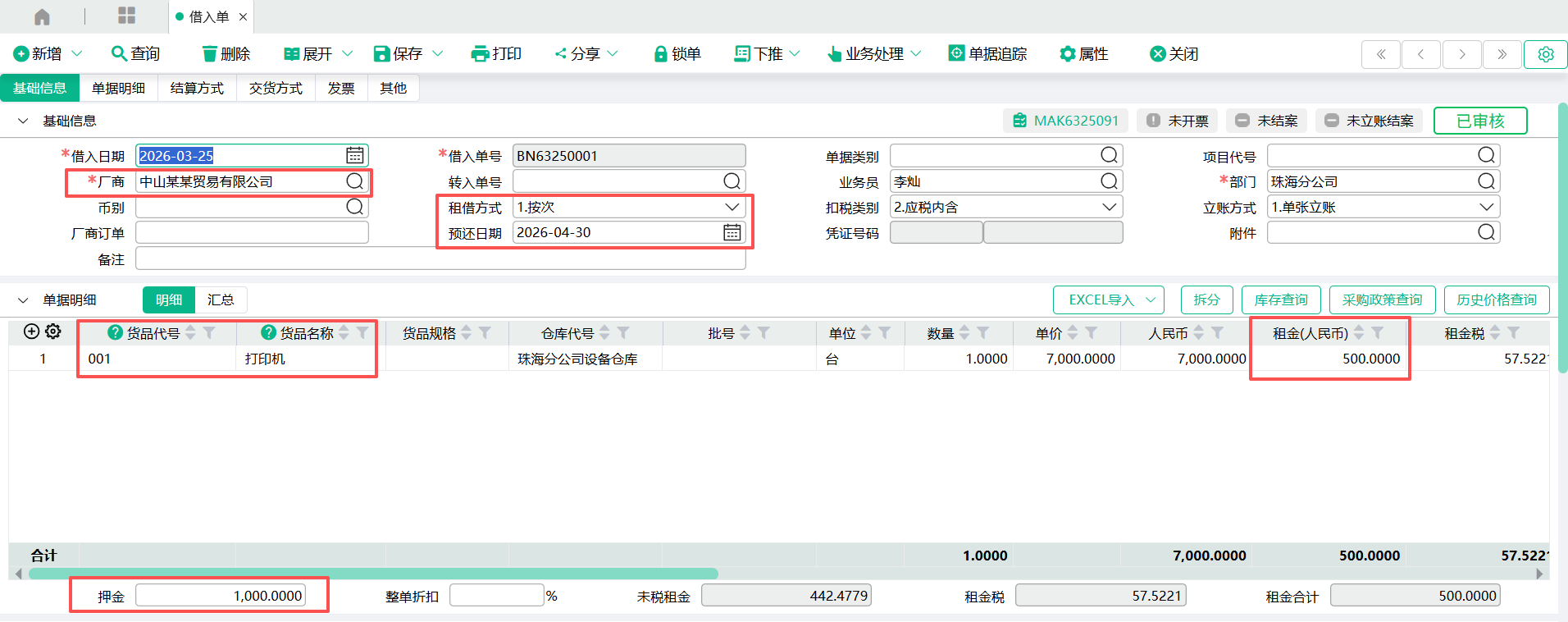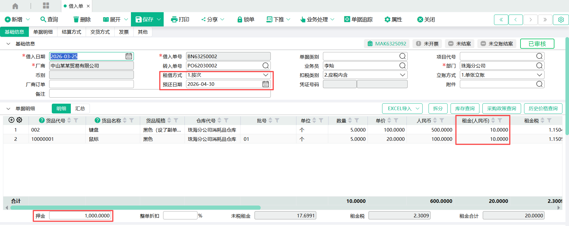(1)进入【借入单】页面,输入表头厂商代号、部门,输入表身货品代号、仓库代号、数量、单价、租金、押金,点【保存】。