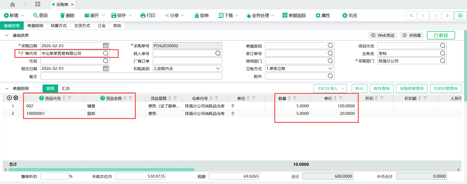 (1)新增一张【采购单】