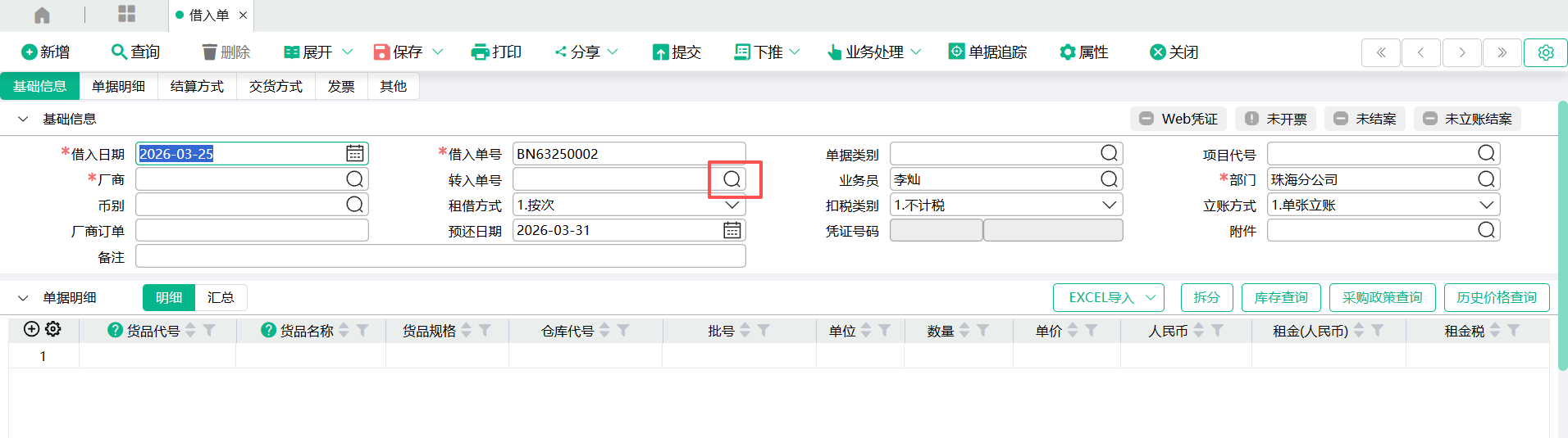 菜单位置:供应链——采购管理——借入管理——借入单