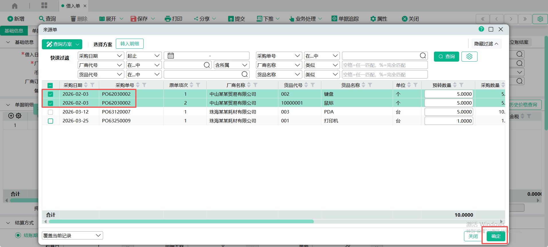 (2)进入【借入单】页面,点入表头【转入单号】查询窗口,输入过滤条件,查询出采购单,勾选要转入的单据记录,点【确定】 ;