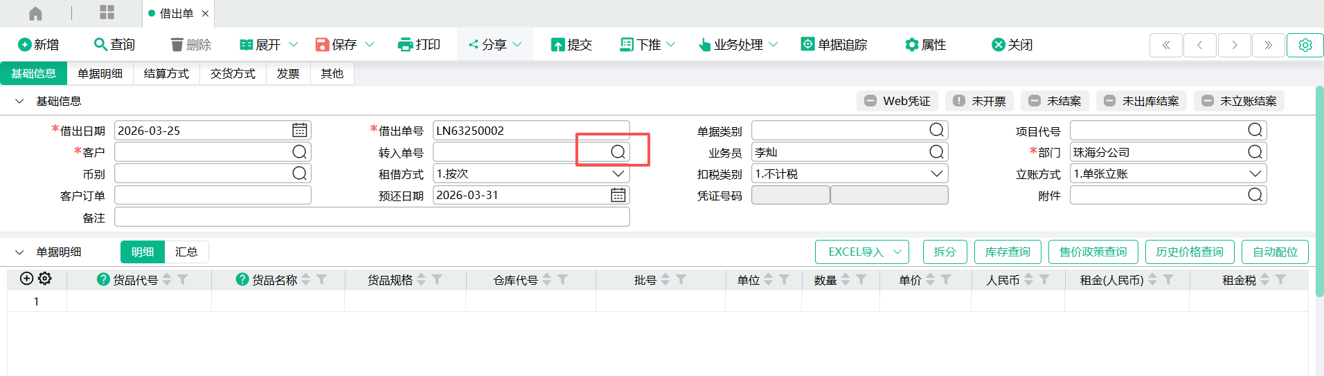 菜单位置:供应链——销售管理——借出管理——借出单