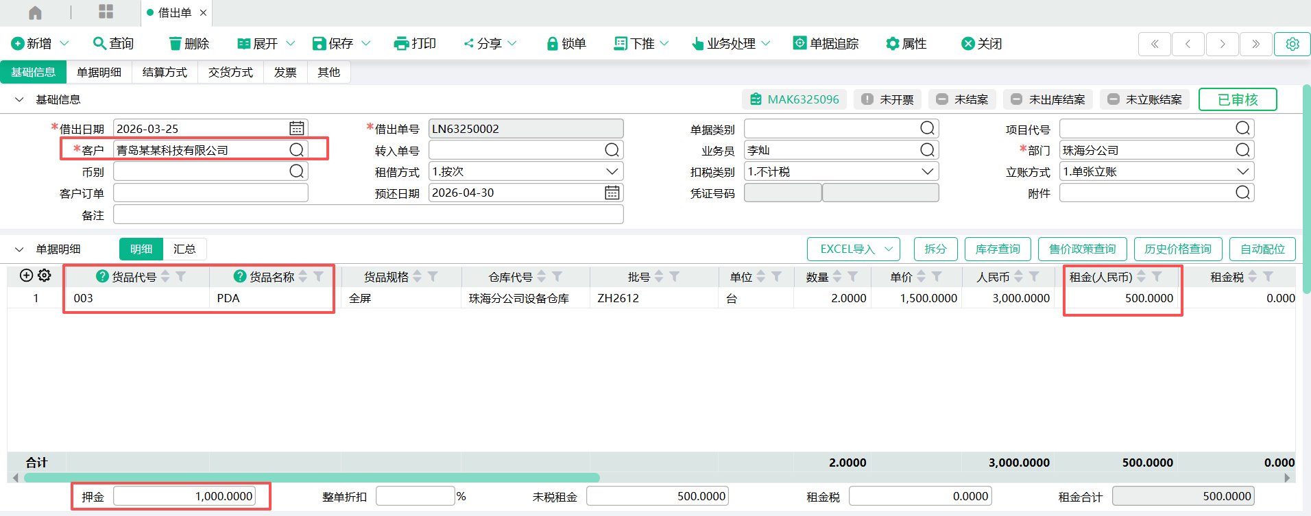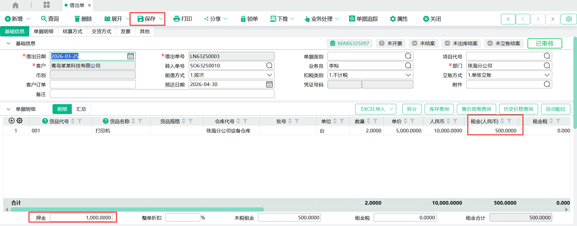 (1)进入【借出单】页面,输入表头客户代号、部门,输入表身货品代号、仓库代号、数量、单价、租金、押金,点【保存】。