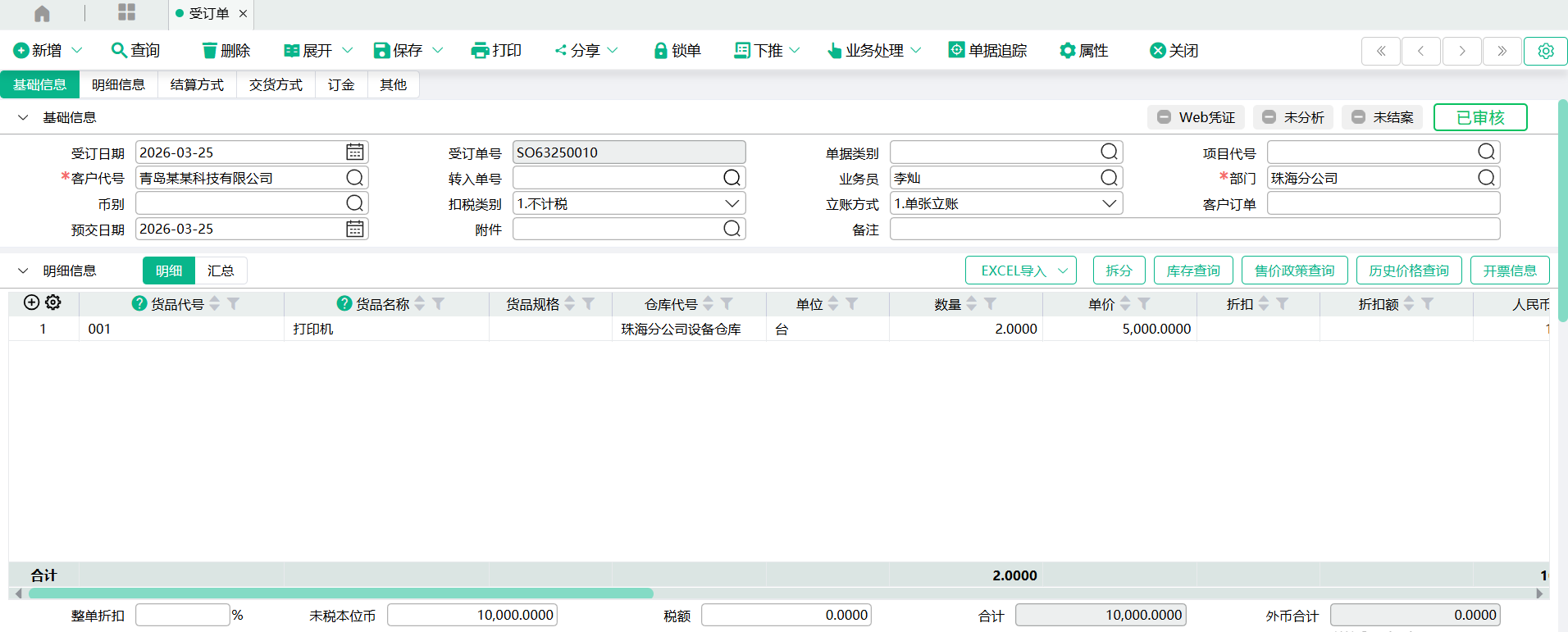 (1)新增一张【受订单】