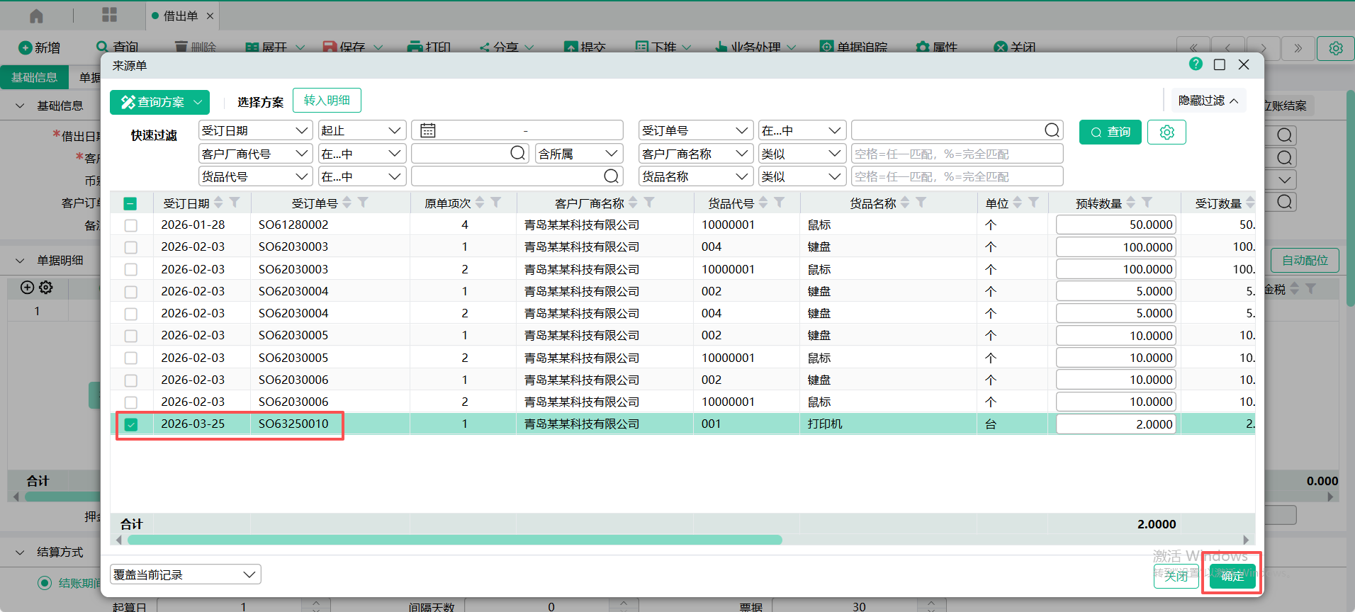 (2)进入【借出单】页面,点入表头【转入单号】查询窗口,输入过滤条件,查询出受订单,勾选要转入的单据记录,点【确定】 ;