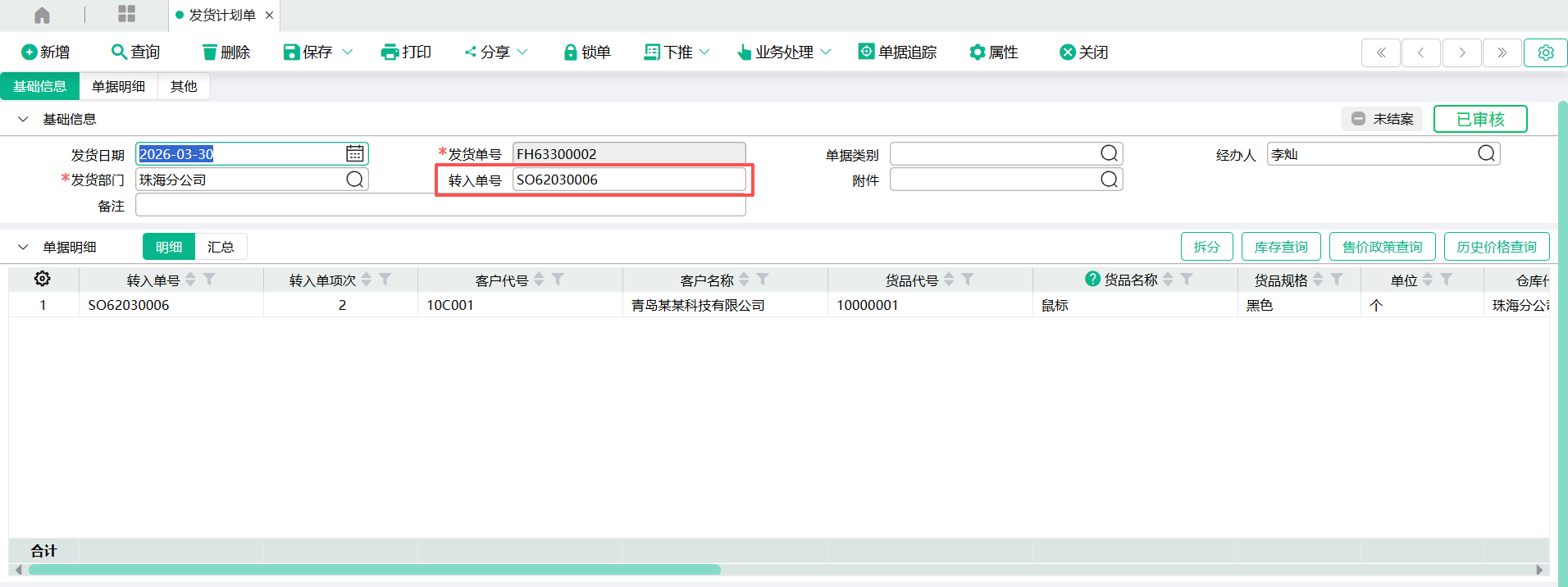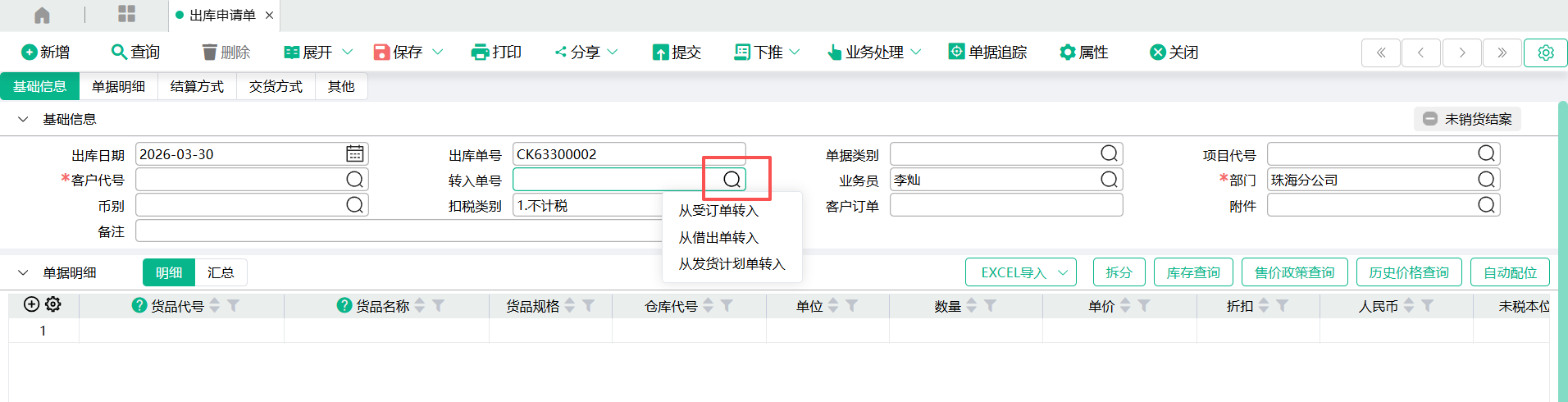 | 转入单号 | 提供转入单号查询视窗,可以从受订单、借出单、发货计划单转入。在此选择单号后,系统会自动带出单据的相关信息。 |