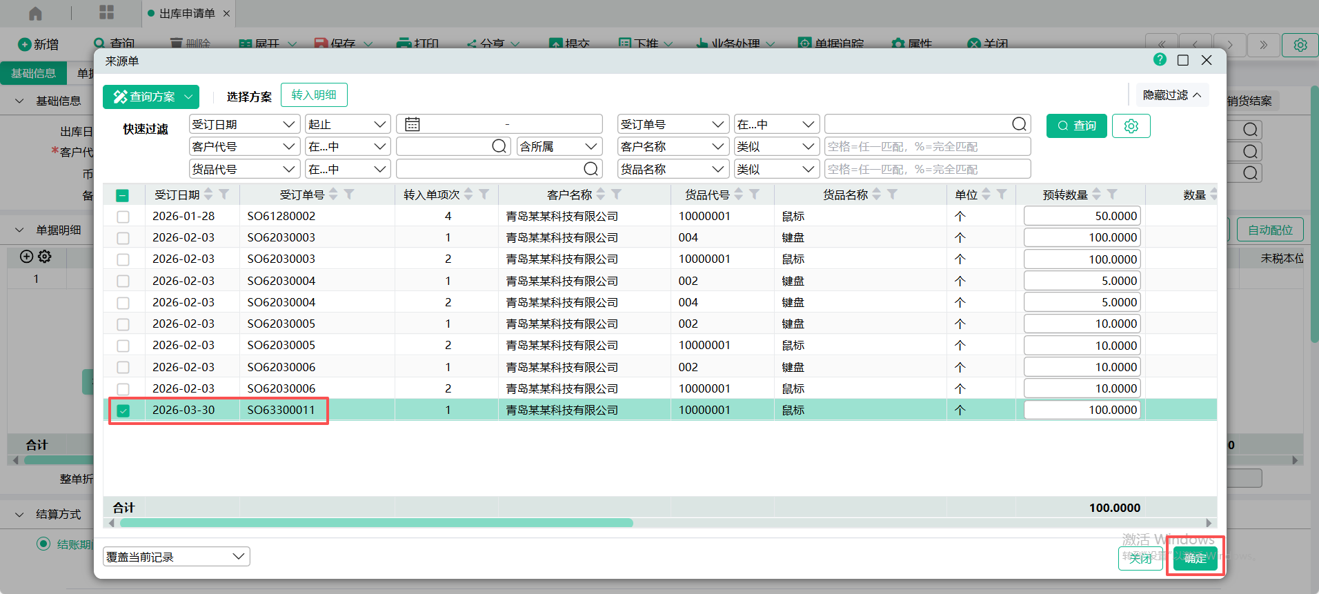 (2)进入【出库申请单】页面,点入表头【转入单号】查询窗口,输入过滤条件,查询出受订单,勾选要转入的单据记录,点【确定】 ;