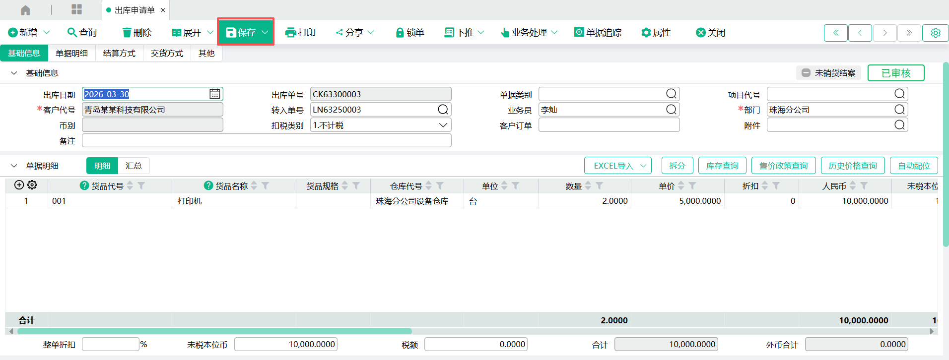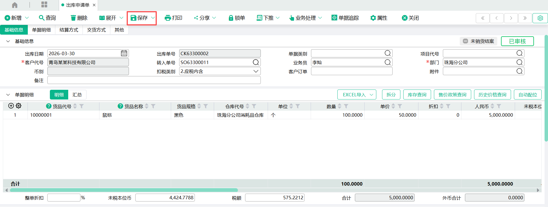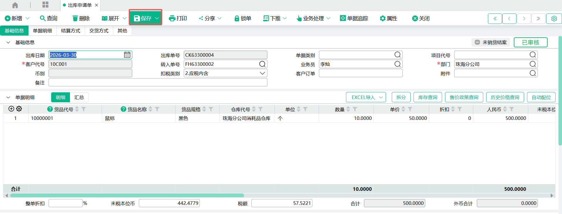 一般来说,在工厂或企业,给正式销货给客户后,货品可能不会立即出货,所以需要经过一个货品出库的动作,我们系统中也相应地提供了出库申请单的流程,当货品发出时,录入一张出库申请单表示此货品已出库,此出库动作是不会影响到货品的分仓存量及客户的帐款数。