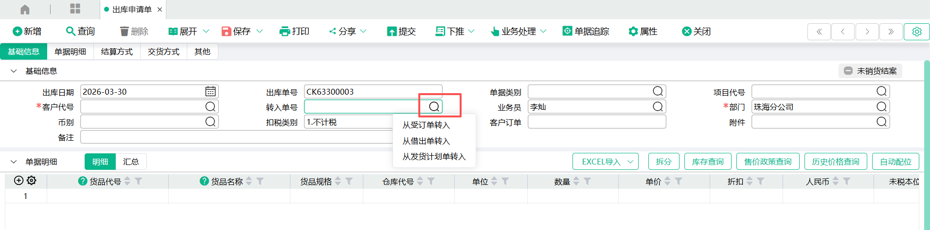 菜单位置:供应链——销售管理——出库管理——出库申请单