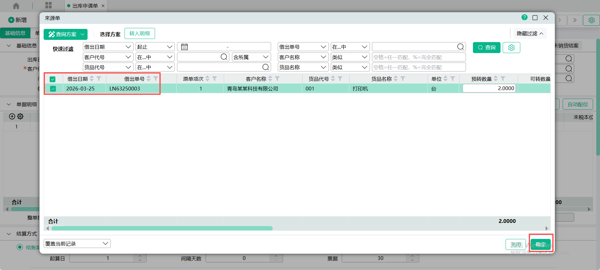 (2)、进入【出库申请单】页面,点入表头【转入单号】查询窗口,输入过滤条件,查询借出单,勾选要转入的单据记录,点【确定】 ;